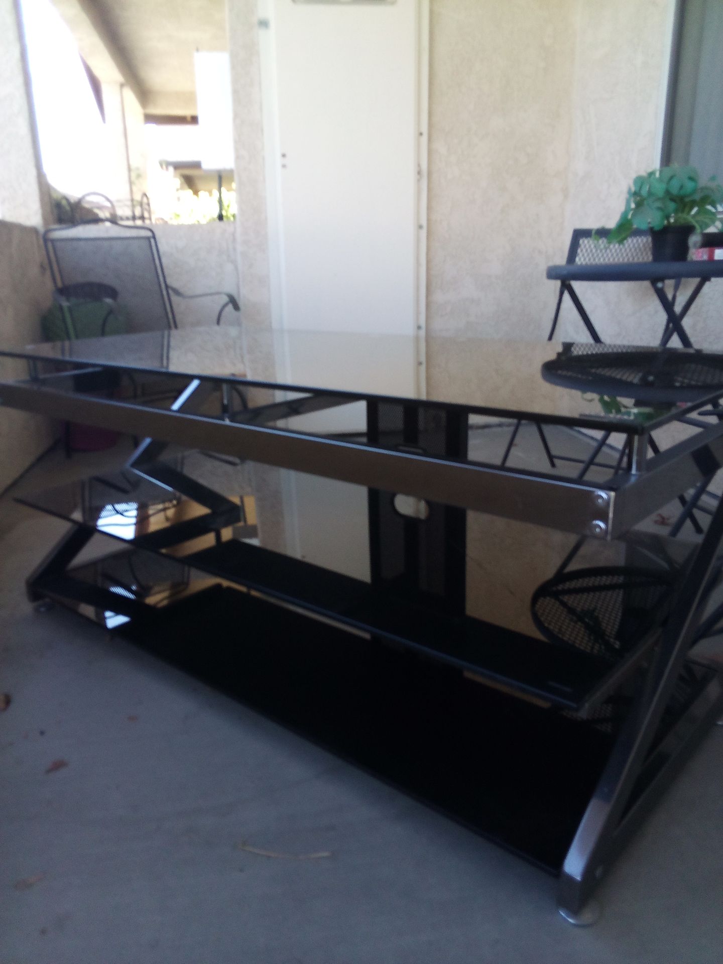 Black smoked glass, two bottom shelves are removable. Top has minor scratches otherwise it is a very nice entertainment center will hold a flat screen TV on stand in the back for swivel or pull out price comes with best offer ability had it offered for 150 but it needs to go