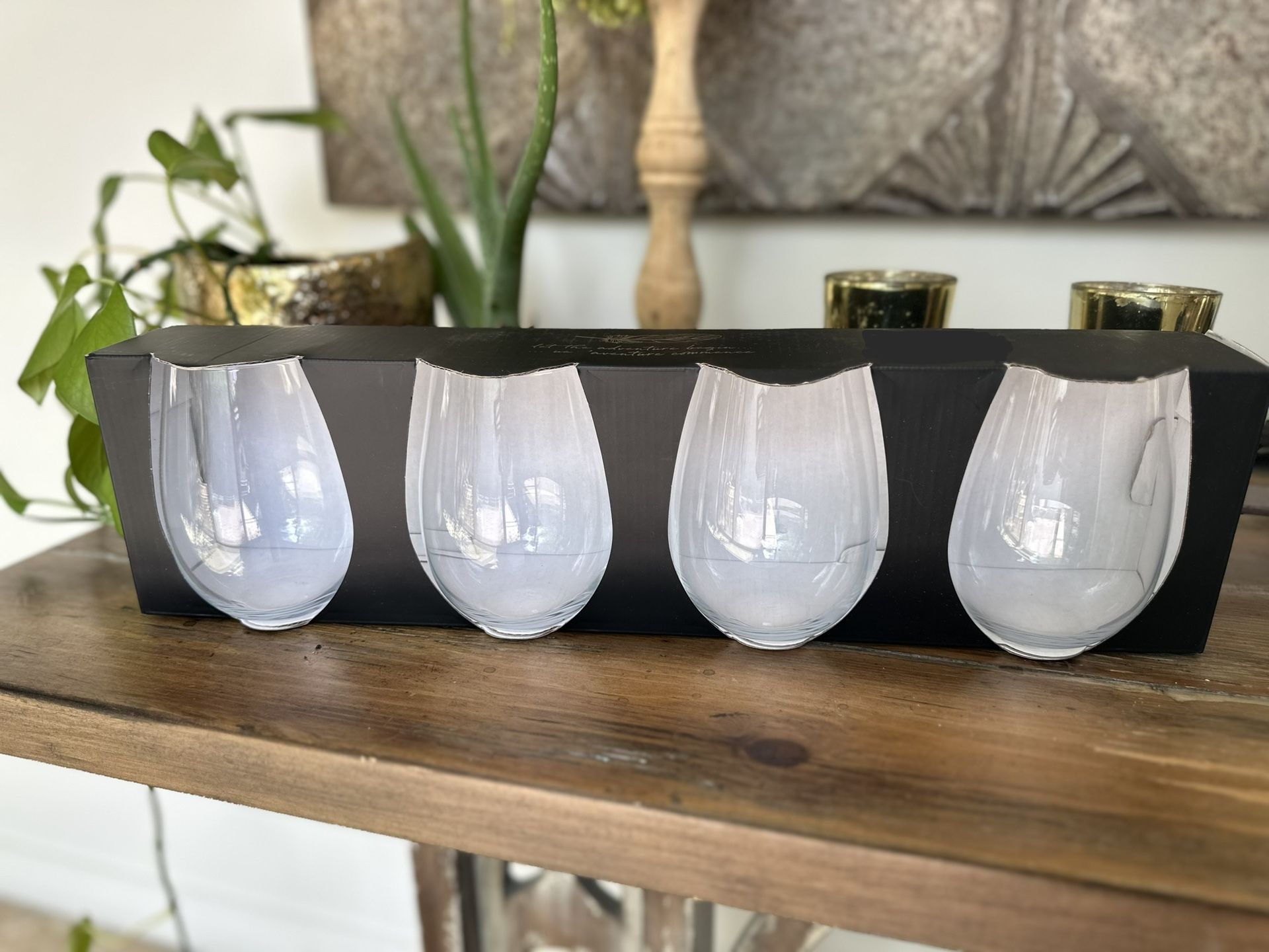 Stemless wine glasses. New and still in the box Rachel Zoe stemless wine glasses. New, never used. Still in the box. House, home, kitchen, dining, furniture, dishes, restaurant, plates, cups, living room, table, office, bar, salon, boutique, gifts, birthday, baby shower, anniversary, Christmas, thanksgiving, party,