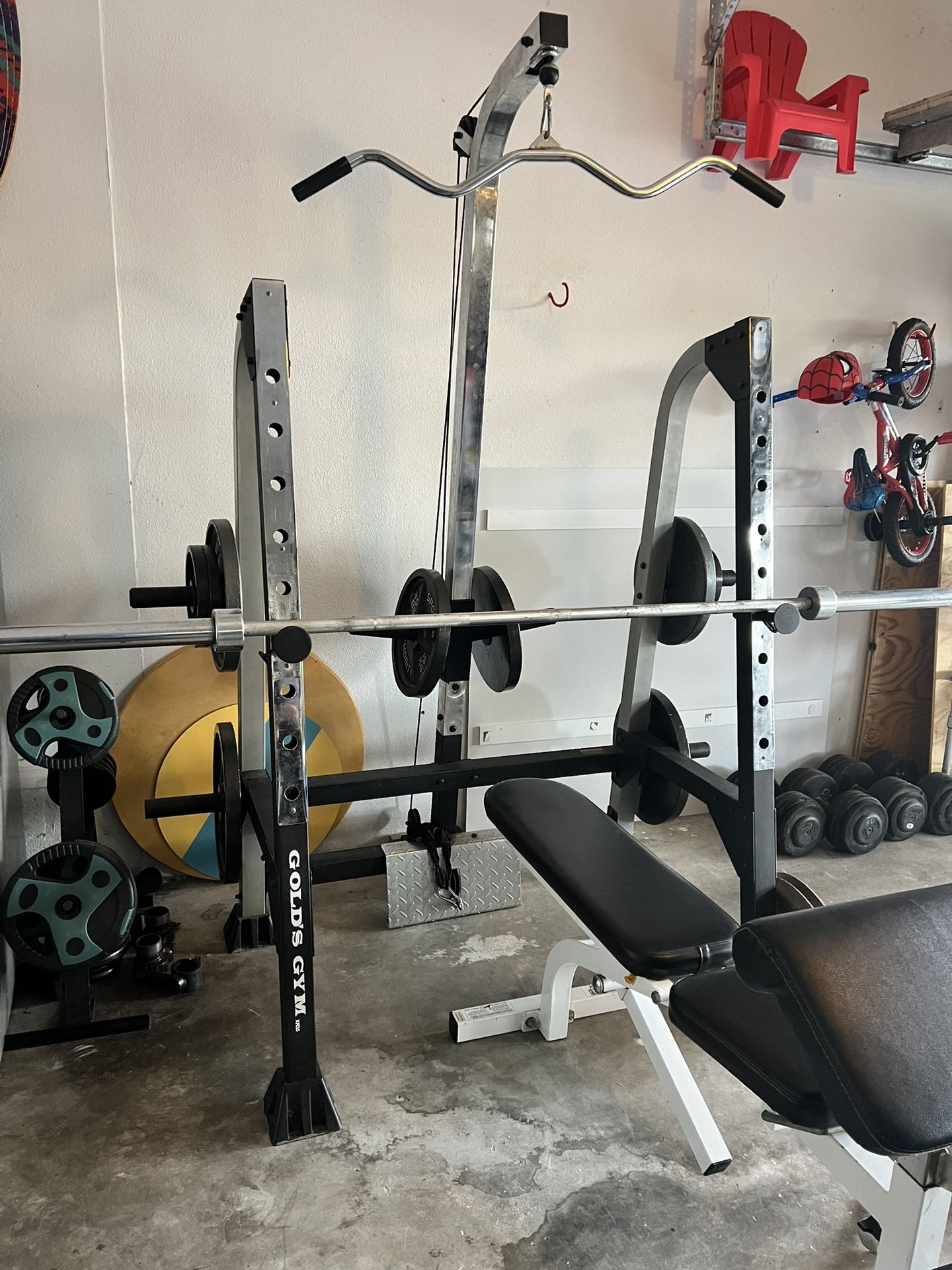 Will sell whole lot or individual pieces. Items: 45 lb Olympic bar -$120 Olympic plates ($0.85/lb) 2 x 33 lb = $56 Adjustable bench Bench - $75 Curl bar attachment for bench - $30 Gold gym xr35 home system ~$215 Comes with various attachments