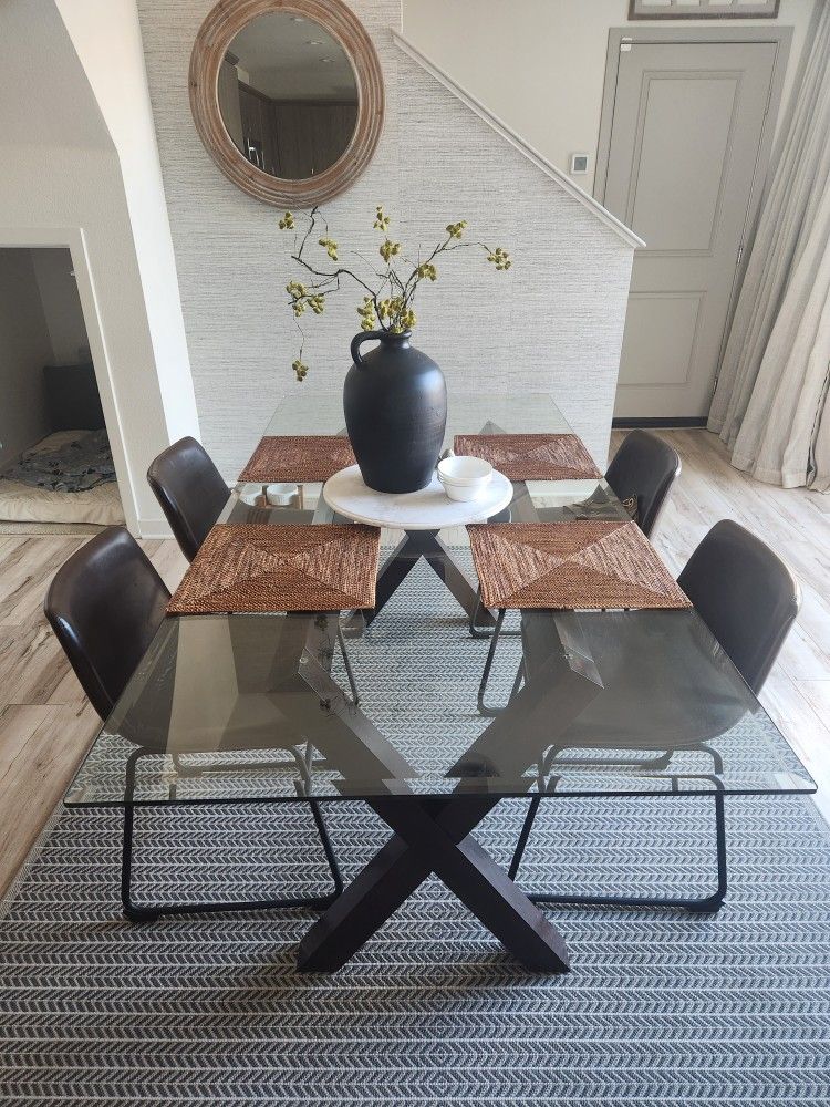 Glass top, dark wood base, 4 dark brown faux leather chairs. 78x38.