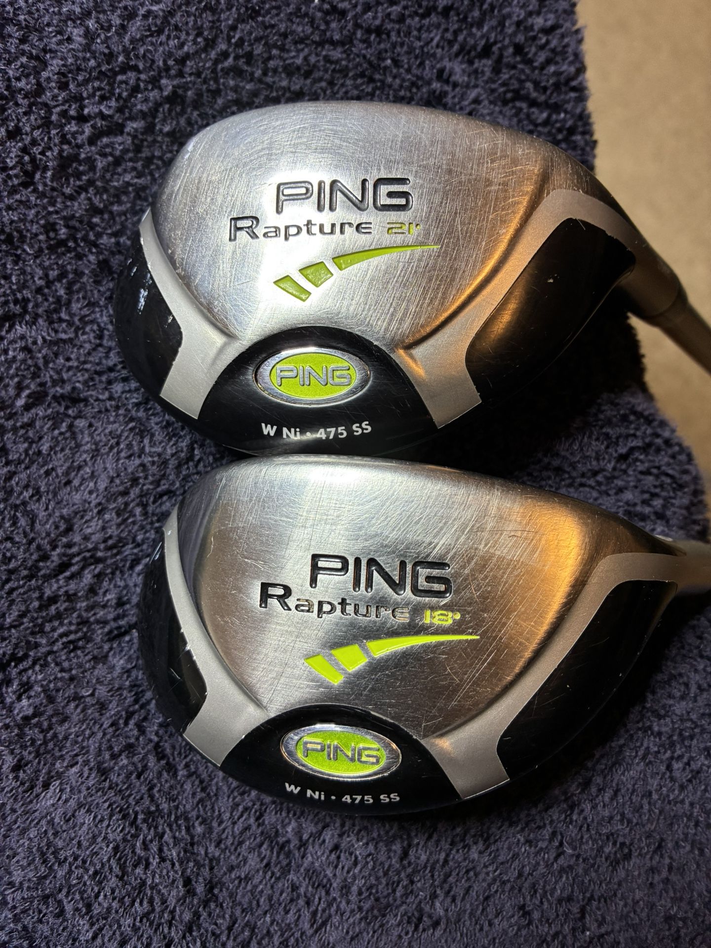 Used Ping Rapture 18 degree & 21 degree hybrid clubs. Ping TFC 909 Graphite Shafts Regular Flex.