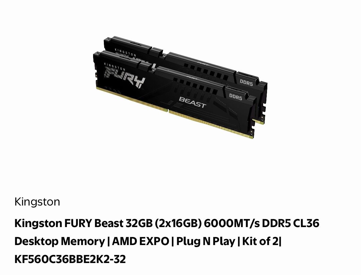 Kingston FURY Beast 32GB (2x16GB) 6000MT/s DDR5 CL36 Desktop Memory | AMD EXPO | Plug N Play | Kit of 2| KF560C36BBE2K2-32 I bought this less than a week ago it’s in my computer now so you can come and see it works perfectly! I have another set of memory. I wanted to swap it, but I changed my mind.