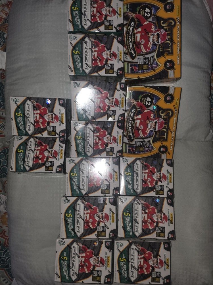New Sealed Panini 2025 NFL Football Boxes. 2 Sealed 2025 Panini select mega boxes and 12 2025 Panini prizm blaster Boxes. Asking 450 Panini Topps NFL sports basketball football jordan bo nix rookies apple iphone Samsung galaxy