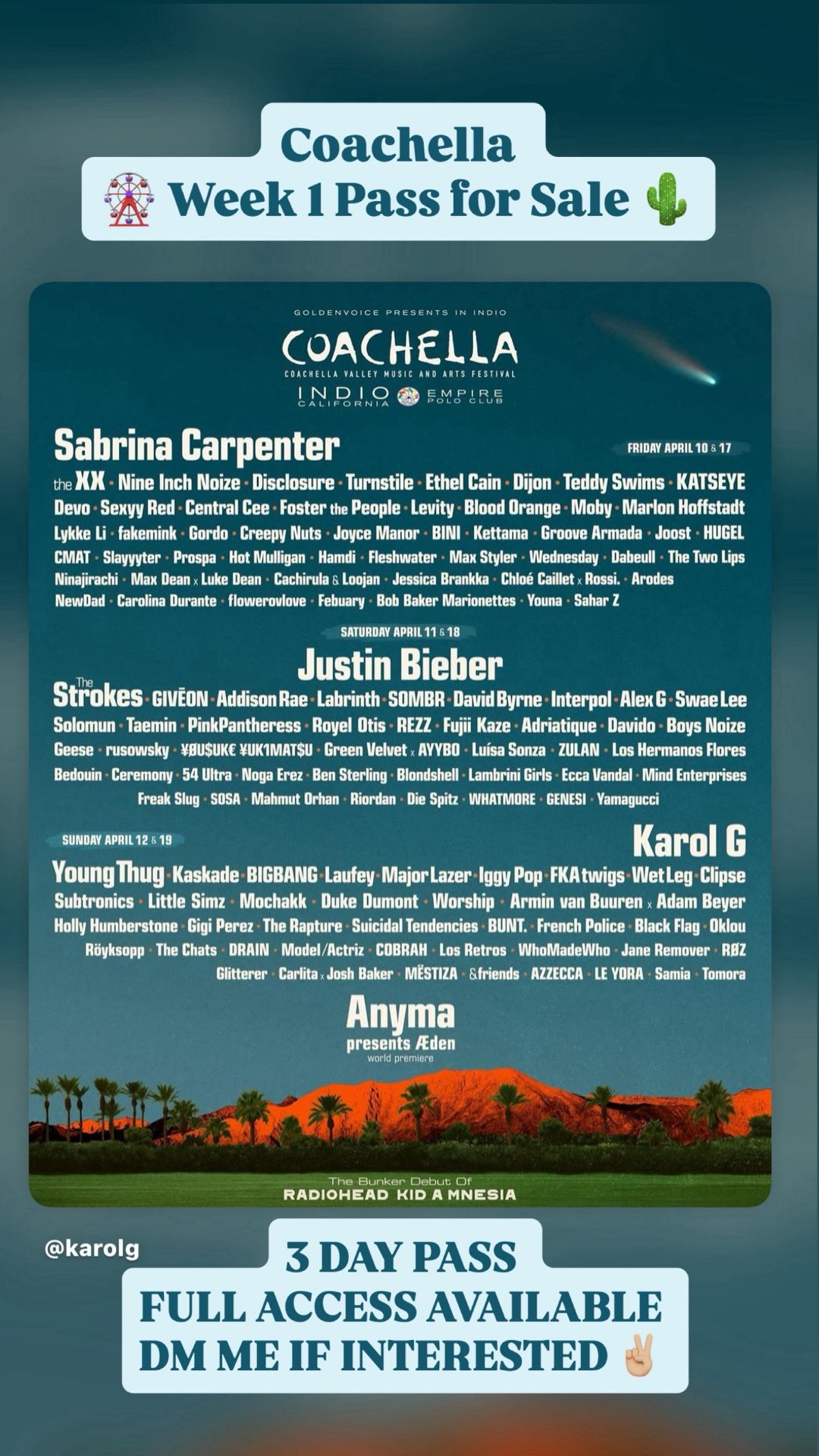 Selling 3 day Coachella ticket Week 1 We can meet in person or do digital download through AXS. Please DM if you have more questions