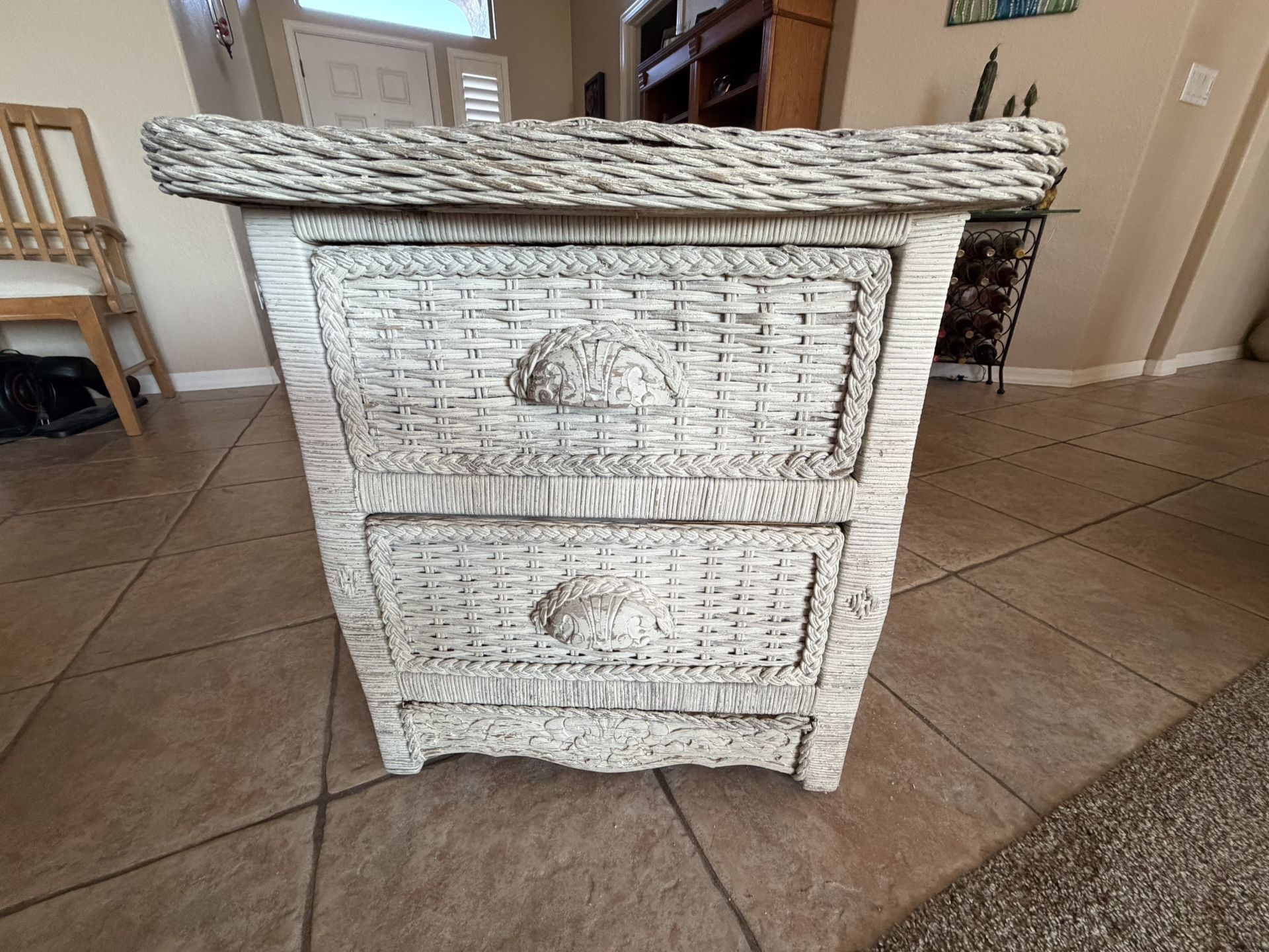 Here is a neat piece if you like to refurbish furniture! Cute heavy antique wicker side table/ nightstand that needs a fresh coat of paint to make new again. It is 22”W x 17-1/2”x 23”T. Braiding at bottom, & lots of detailing Has a lot of character, made well & is heavy, needs a new coat of paint! 2 drawers roll out easily. Bought at Pier I. Crossroads are Power & Queen Creek Rds. Porch pickup anytime.