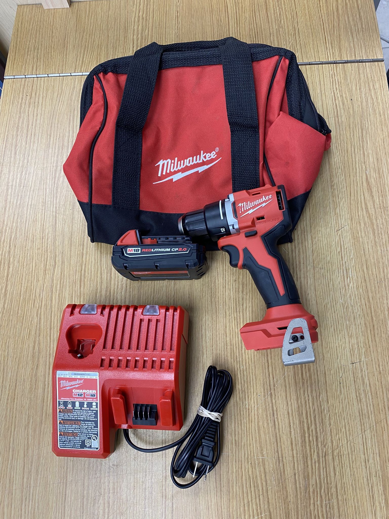 New opened box condition The drill kit comes with the Drill/Driver, (1) M18 REDLITHIUM CP2.0 Compact Batteries, (1) M18/M12 Multi-Voltage Charger, and (1) Contractor Bag. The Compact Brushless ½" Drill/Driver is part of the M18 system, fully compatible with over 250+ other tools!