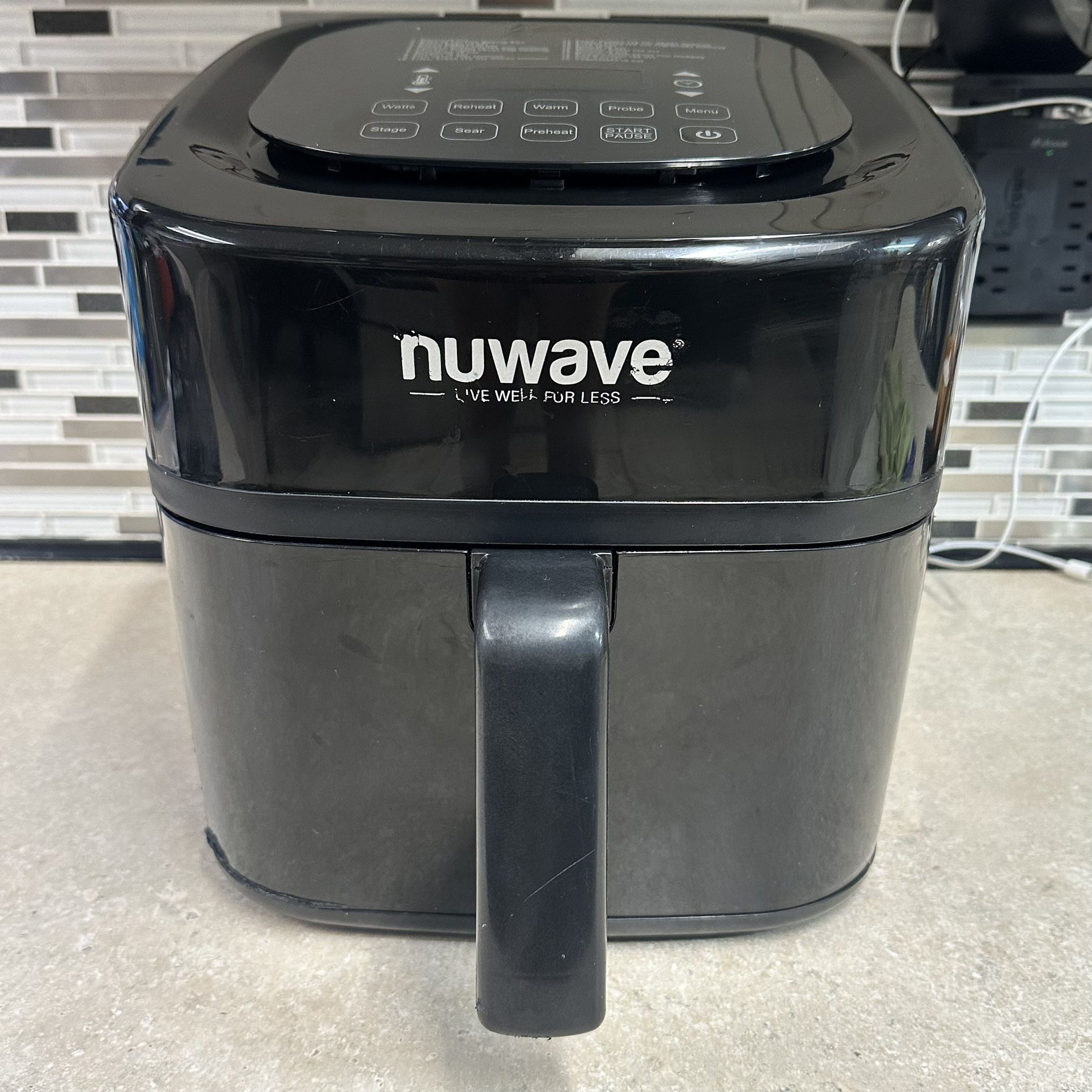 NuWave Brio 6-Quart: 7-in-1 Digital Air Fryer Oven with One-Touch Digital Controls, Automatic Shutoff. In good preowned condition. One small blemish in front lower left corner. See photo 1. Fully functional tested and working. The only accessory included is the air circulator. Pickup in Punta Gorda by Home Depot.