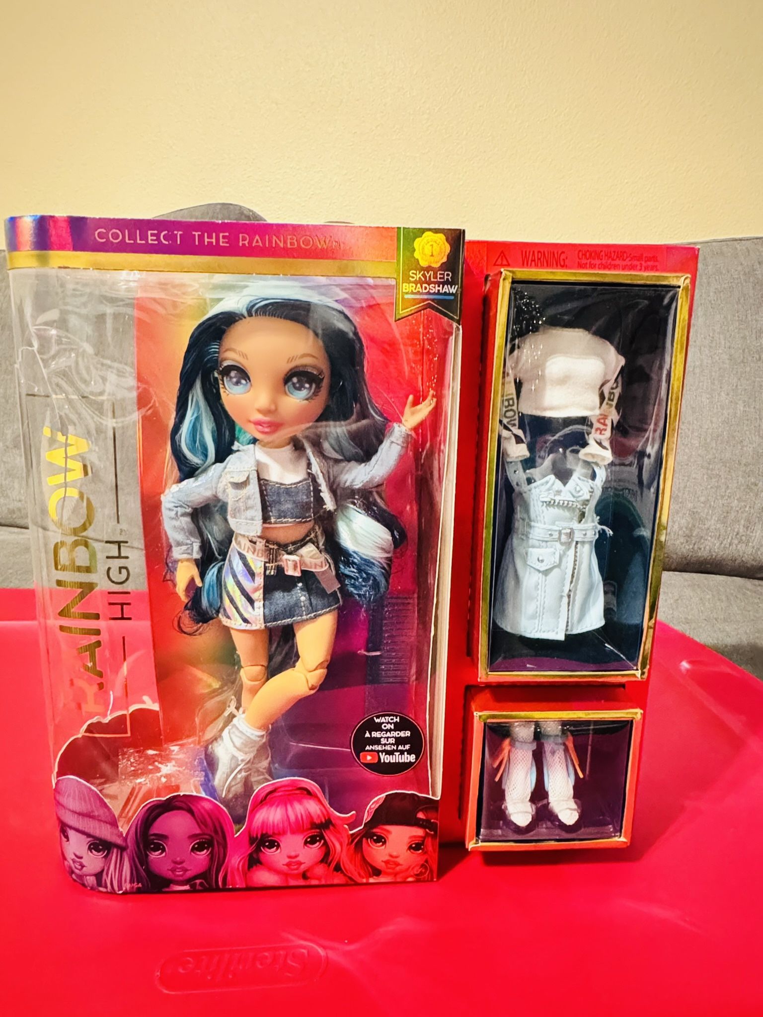 SKYLER BRADSHAW - blue Skyler has a classic style with denim and a little sparkle. She comes with a denim crop top and skirt, denim jacket dress, dress, cute socks, heels and more. Box is damaged but unopened