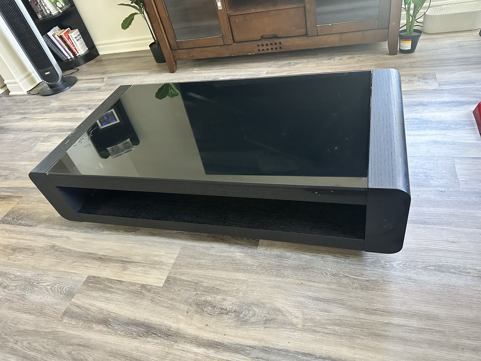Modern black glass-top coffee table with lower shelf. Good condition. Clean & sturdy. Dimensions: 47” L × 23.5” W × 12.5” D