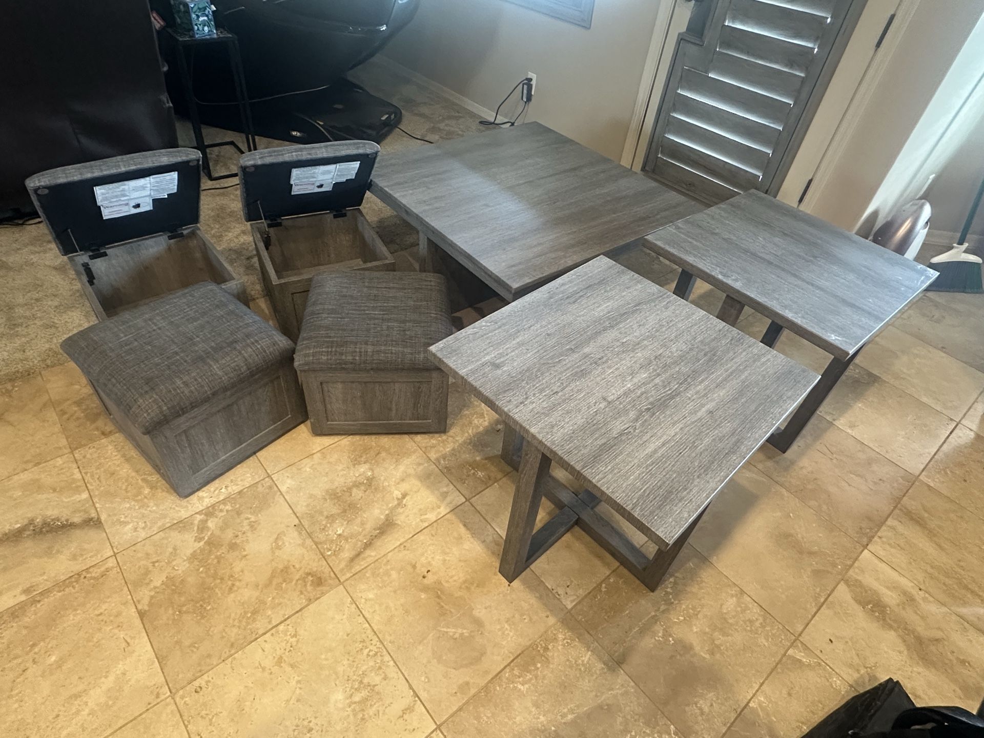 Great coffee table (does have a little damage on one corner), 2 end tables and there are 4 ottomans / storage that roll under the coffee table.