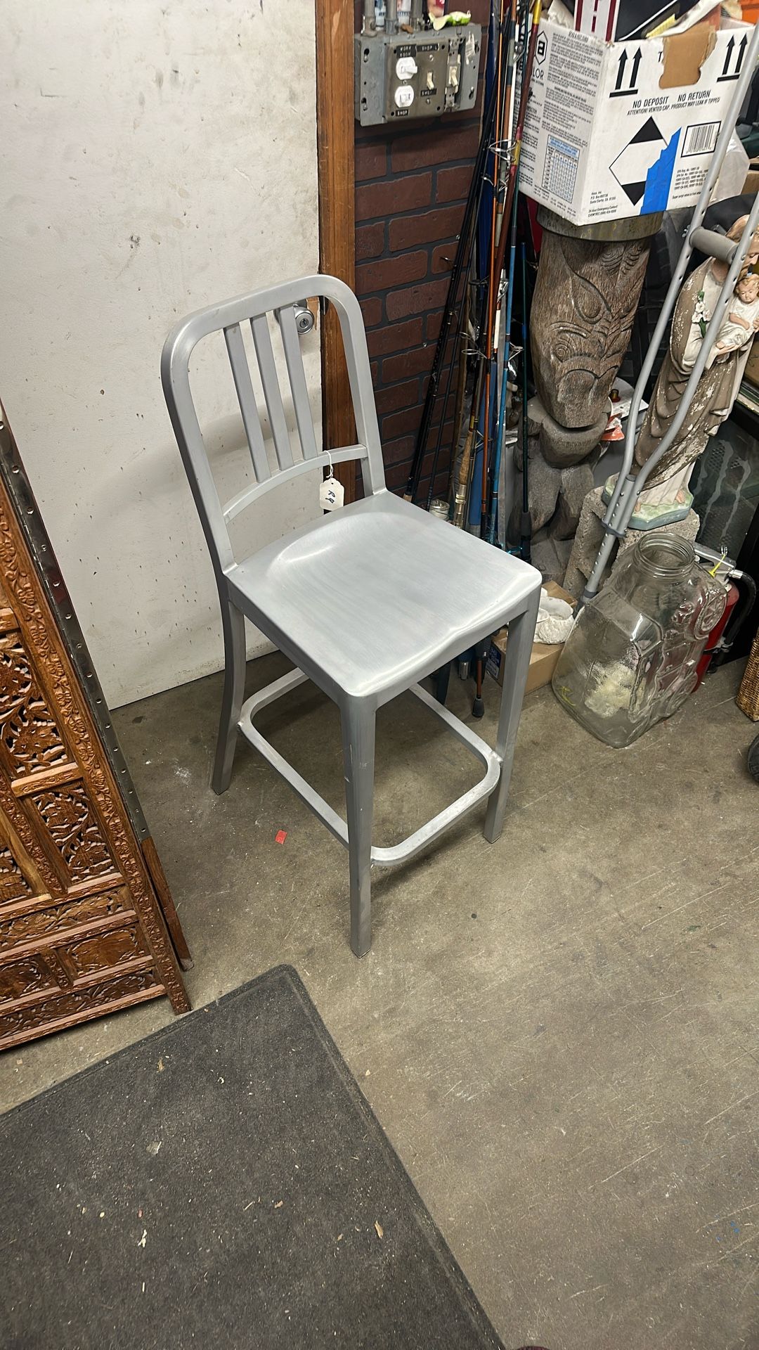 Selling a solid industrial-style metal stool with a clean silver finish and commercial-grade construction. It’s built very similar to the Emeco-style/restaurant stools (welded frame, rigid footrest, sturdy seat/back), but I cannot find a maker stamp, so I’m listing it as unbranded.