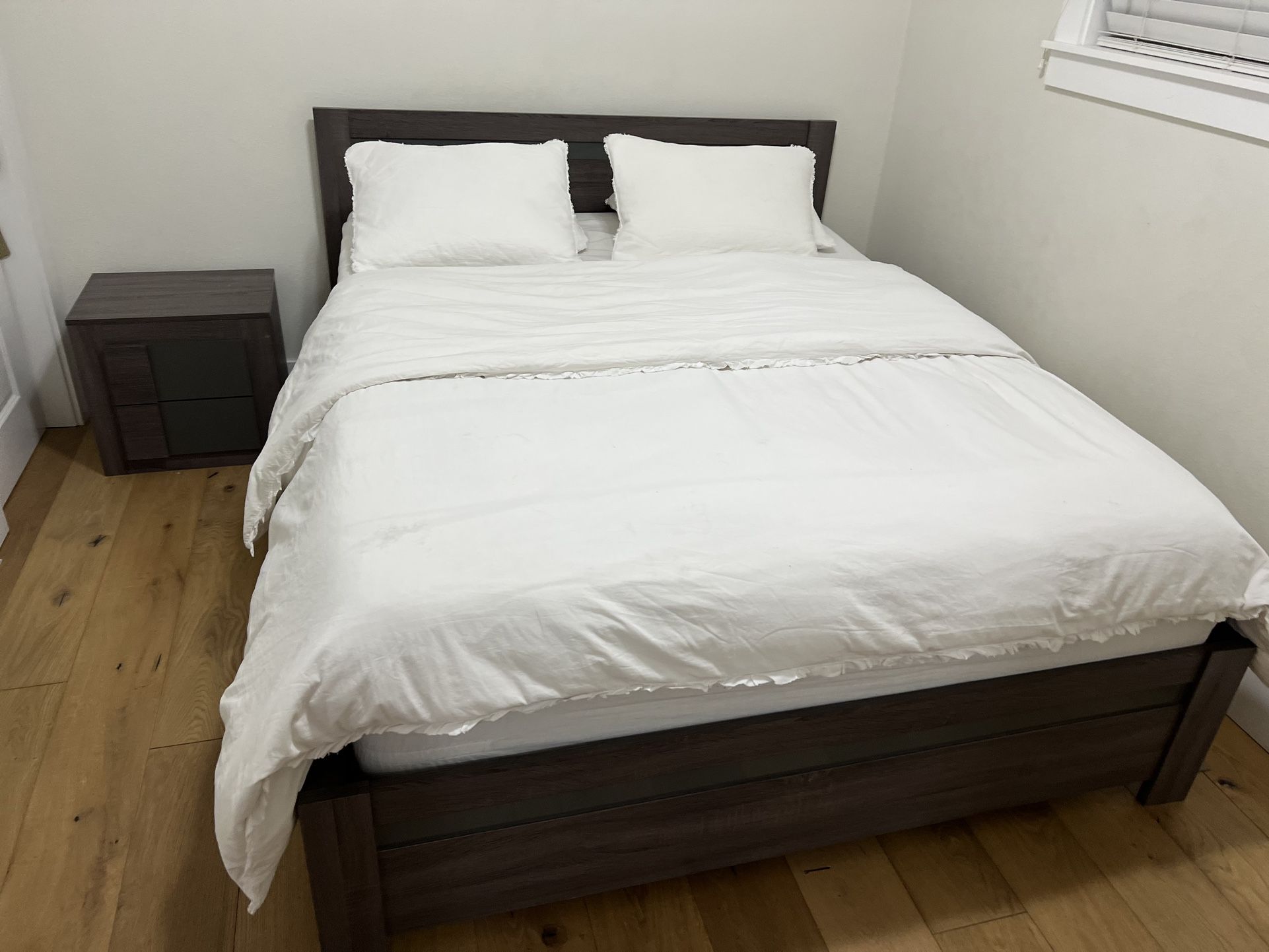 Selling a Queen dark gray wood bed & a night stand In good condition Night stand -$100 Bed -$300 No mattress included