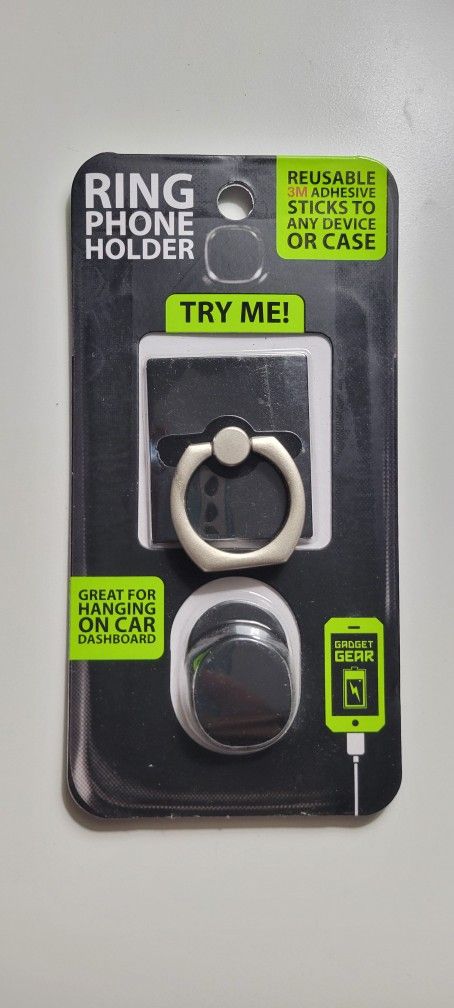 Gadget Gear Phone Holder Ring in Countertop Display Description: Never drop your phone again! This portable stainless steel ring phone holder and on-the-go phone stand with powerful 3M adhesive will help you prevent from dropping your phone and allow you to prop your phone up on a flat surface near you! The ring can rotate to a 180 and 360 degree for a more comfortable adjustment. Its mounting tape will not leave any residue when removed. Square adhesive plate approximately 1.5" x 1.5" and ring is about 1" x 1". The package includes an adhesive hanger phone mount to hang on your car dashboard. Perfect for smartphones and tablets. Each ring comes packaged individually in a blister pack in assorted colors, and eight come in a countertop display. Gadget Gear Phone Holder Ring in Countertop Display