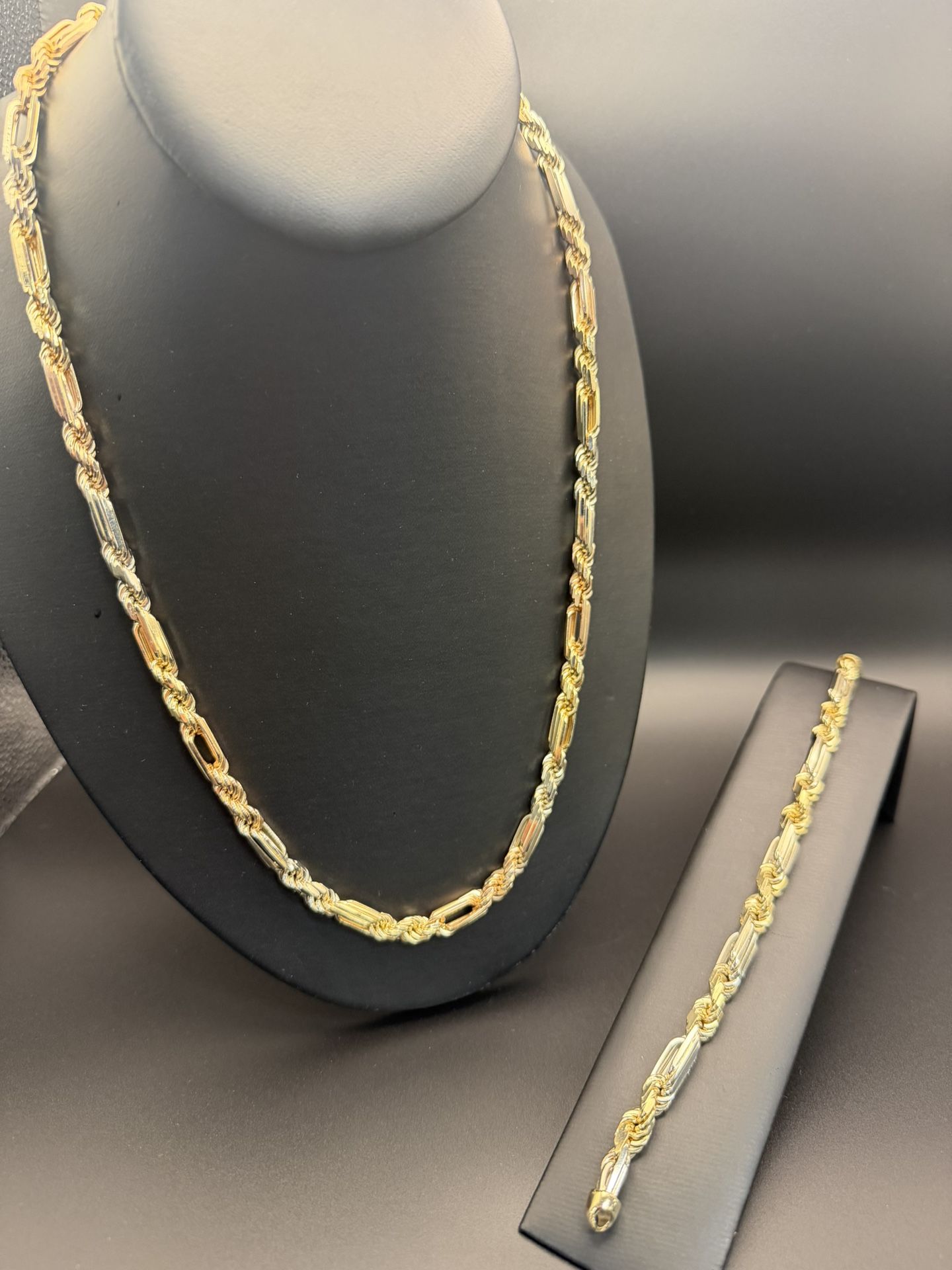 Rope chain 24” long 1/4” wide 88.5 grams 14kt gold Bracelet 9” long 1/4” wide 33.1 grams Total 121.6 grams 14kt solid gold