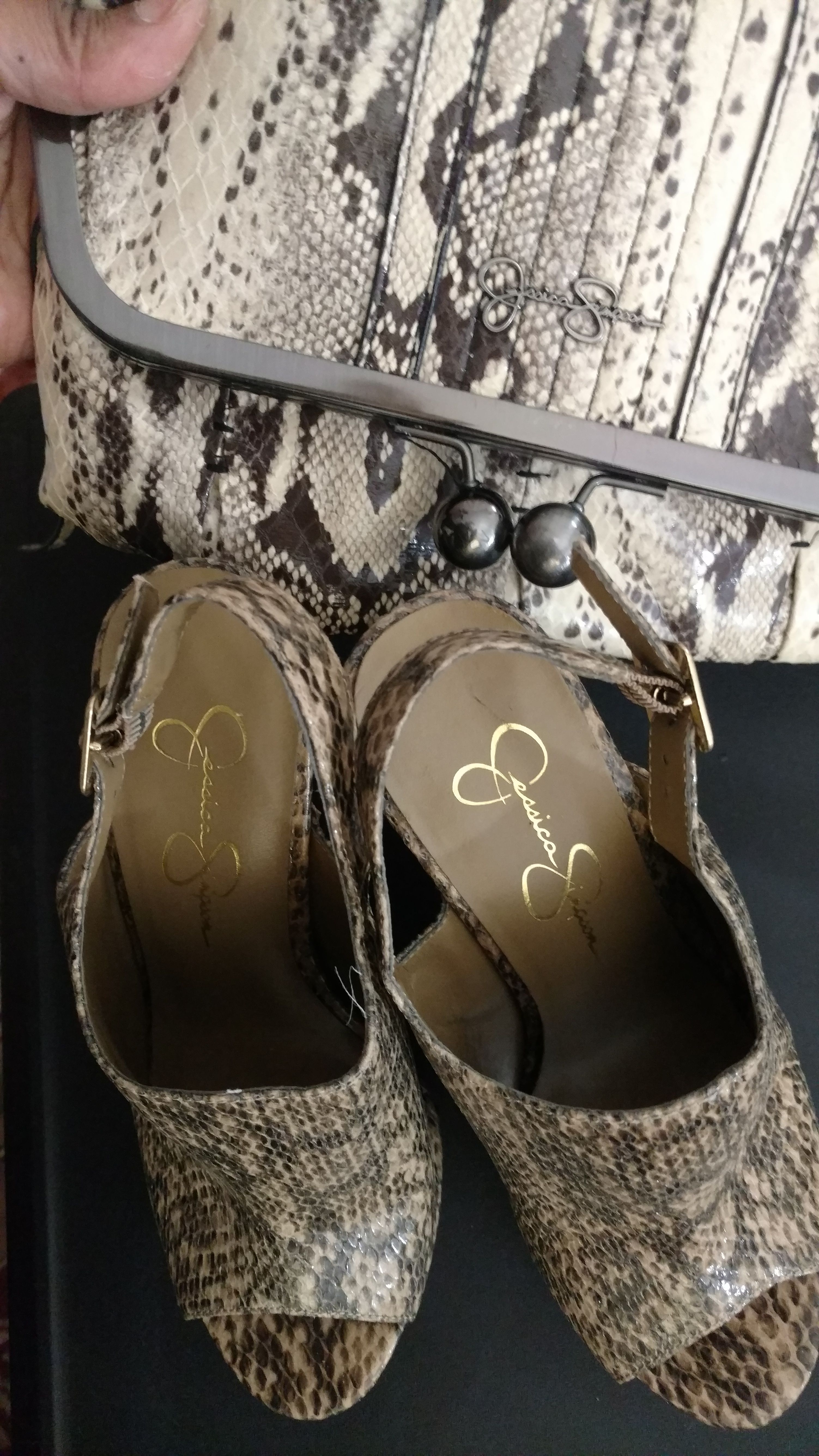 This listing is for a Jessica Simpson snakeskin clutch! It is absolutely beautiful! I actually have a pair of wedge heels by Jessica Simpson that almost match this purse perfectly - size 7 So keep your eyes open! Both both pieces are $20 each! You can mix it up but it goes great with any solid color! Just in time for the holidays! This clutch is brand new and in perfect condition! I accept PayPal and Google Wallet so I'm willing to ship!