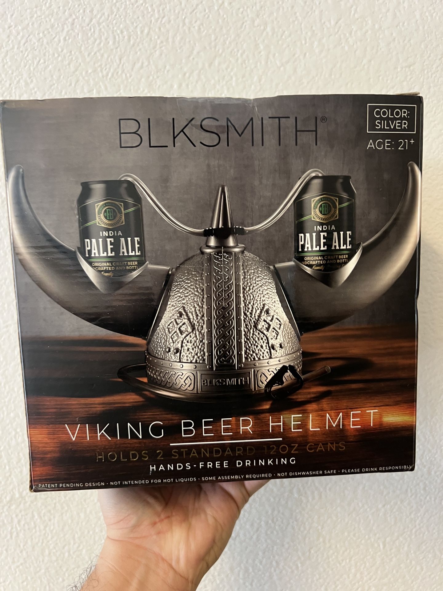 BLKSMITH Viking Beer Helmet Helmet for hands free drinking of beverages from standard size 12oz cans. Brand new in unopened box. Not intended for hot liquids. Some assembly required. Not dishwasher safe. CONTENTS: Viking helmet 2 short tubes L & R horns Stopper valve Top spike Long tube T-fitting Adjustable headband OTHER SPECS: Size: Adult Color: Silver