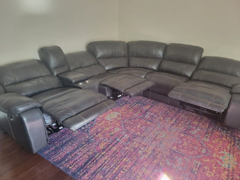 Leather Power Recliner Sectiona Sofa containing three power Recliner and in good condition.