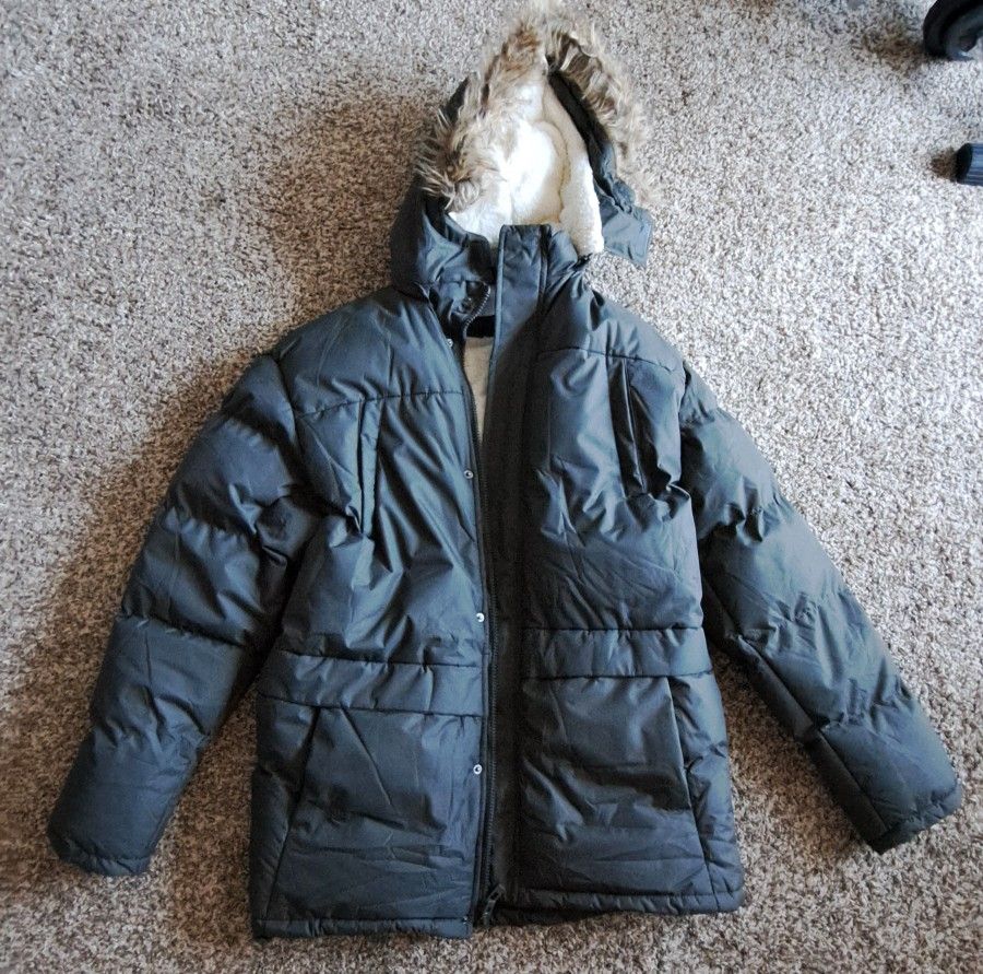 Hello, I am selling a brand new winter long jacket for men. XL Green Lambswool lining Shoulder straps to carry if you get too warm. Detachable faux fur lined hood. Long style, can unzip from the bottom for more comfortability. Fitted cut throughout, not baggy. Water-resistant Windproof