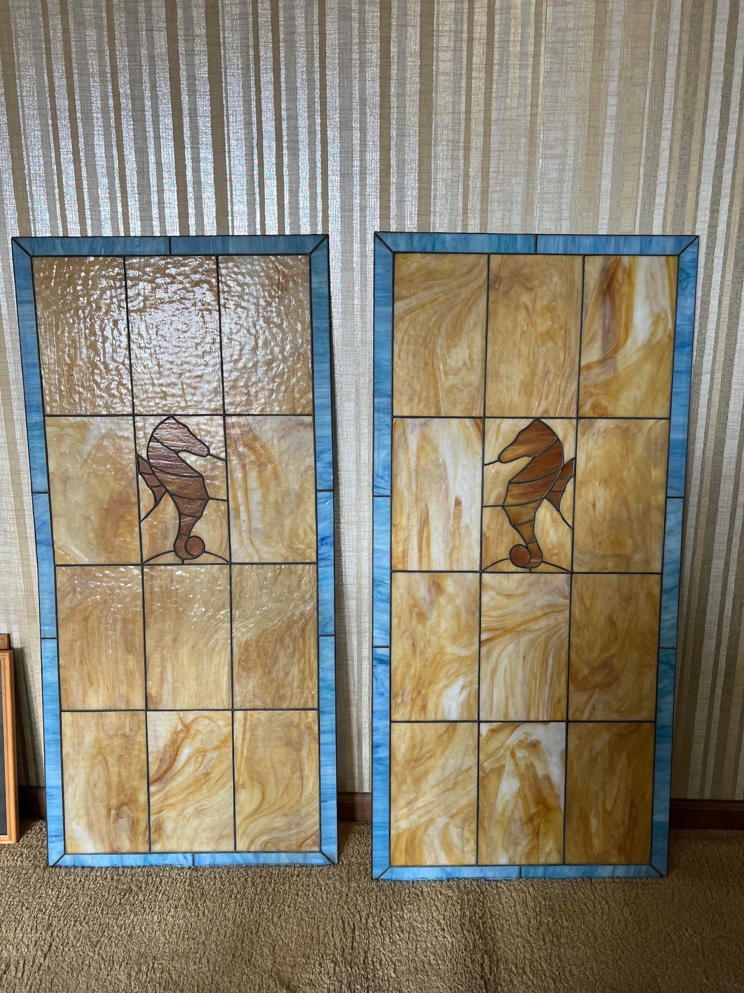 Two large stained glass panels. Taken out when windows were replaced. They were exposed to the elements. One of them is starting to crack in the middle edges, as shown in photos. They’re 21.5” wide and 45.5” long. Sold as a set.