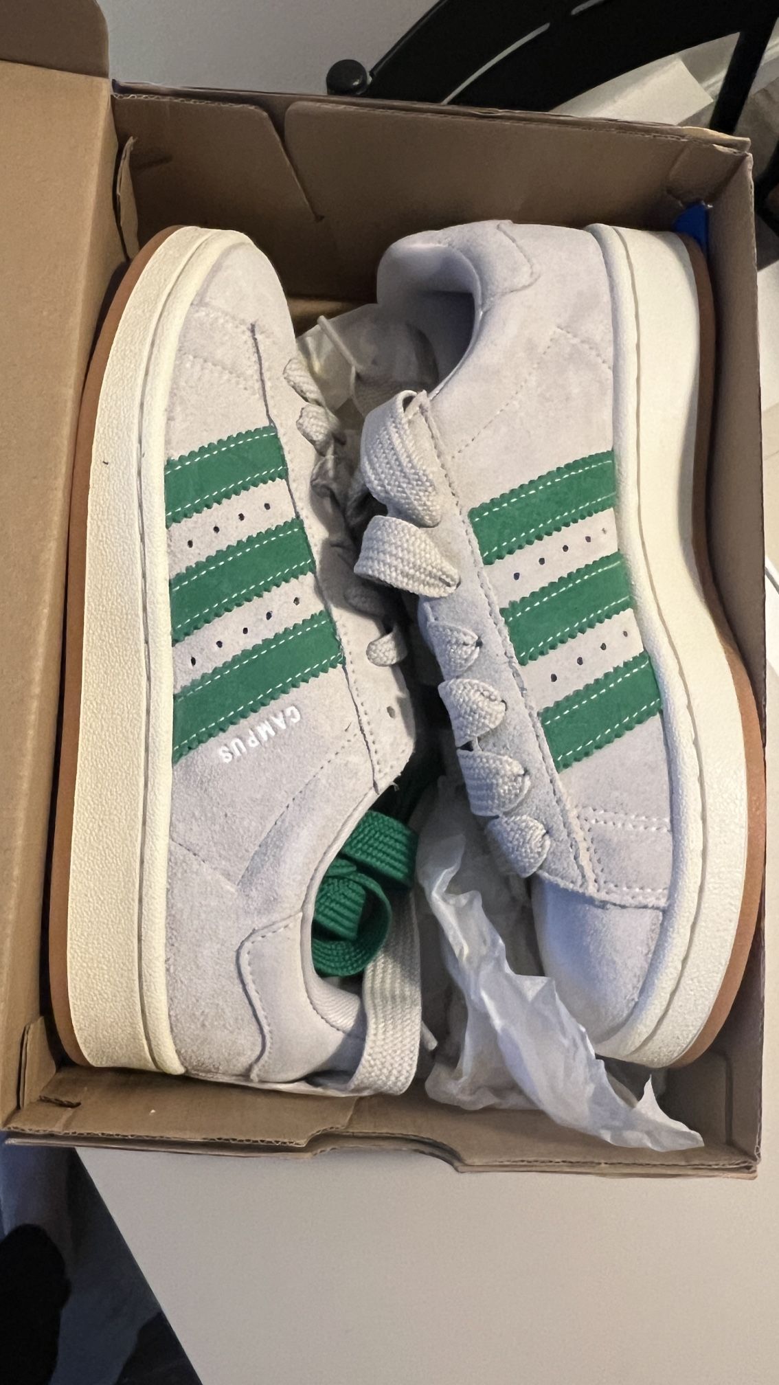 BRAND NEW- NEVER WORN! Adidas Campus 00’s size 5.5 Crème color with green accents extra pair of green laces too! suede!! so soft!!