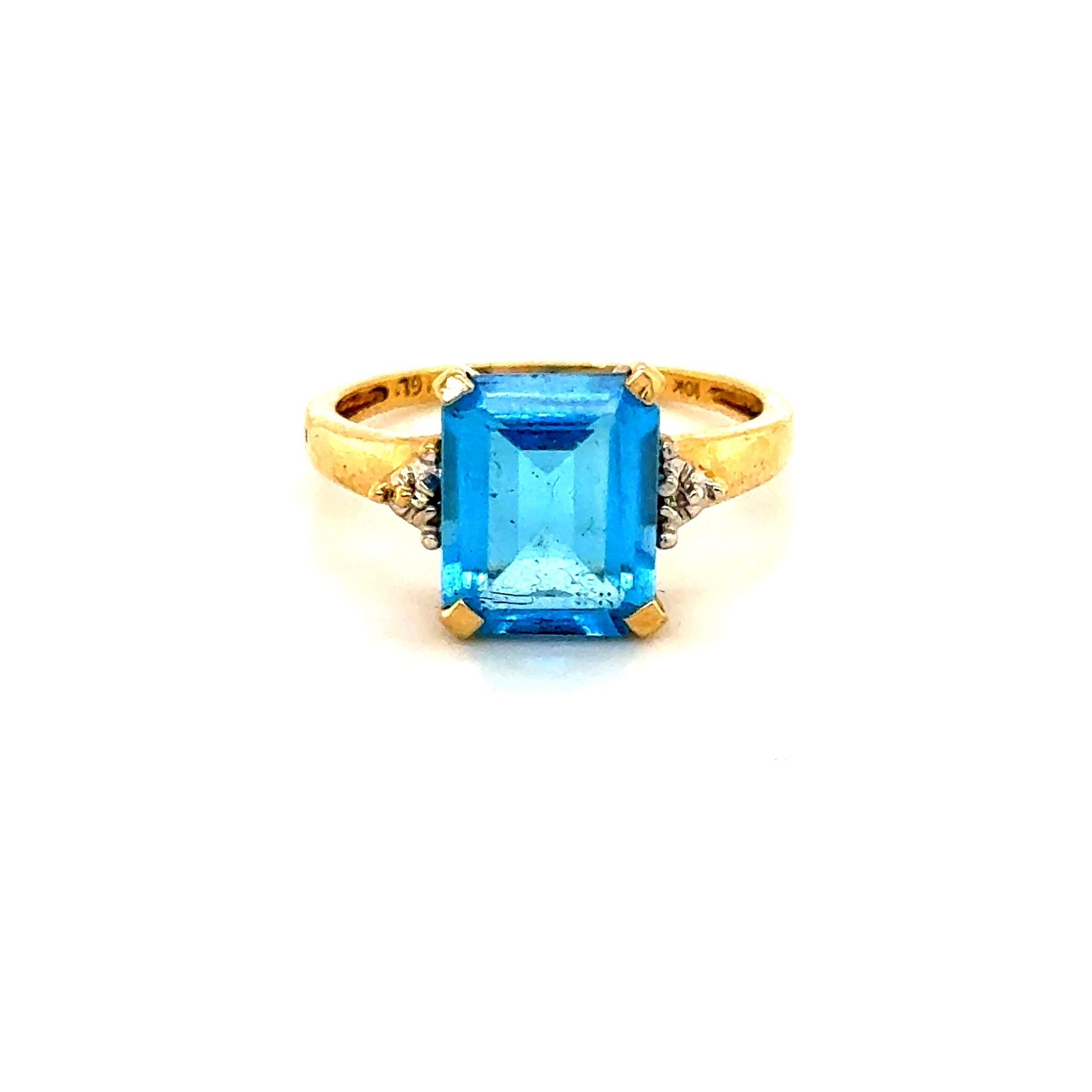 SPECS: Metal: 10k Yellow Gold Metal stamp: 10K LGL Size: 6 Gem: Topaz & Diamonds Gem Size: 10x8mm approx Weight: 2.1g Condition: Preowned Real 10k Yellow Gold Emerald Cut Blue Topaz and Tiny Diamonds Ring, NOT GOLD PLATED OR GOLD FILLED. Note: Pictures are enlarged to show fine details of the product