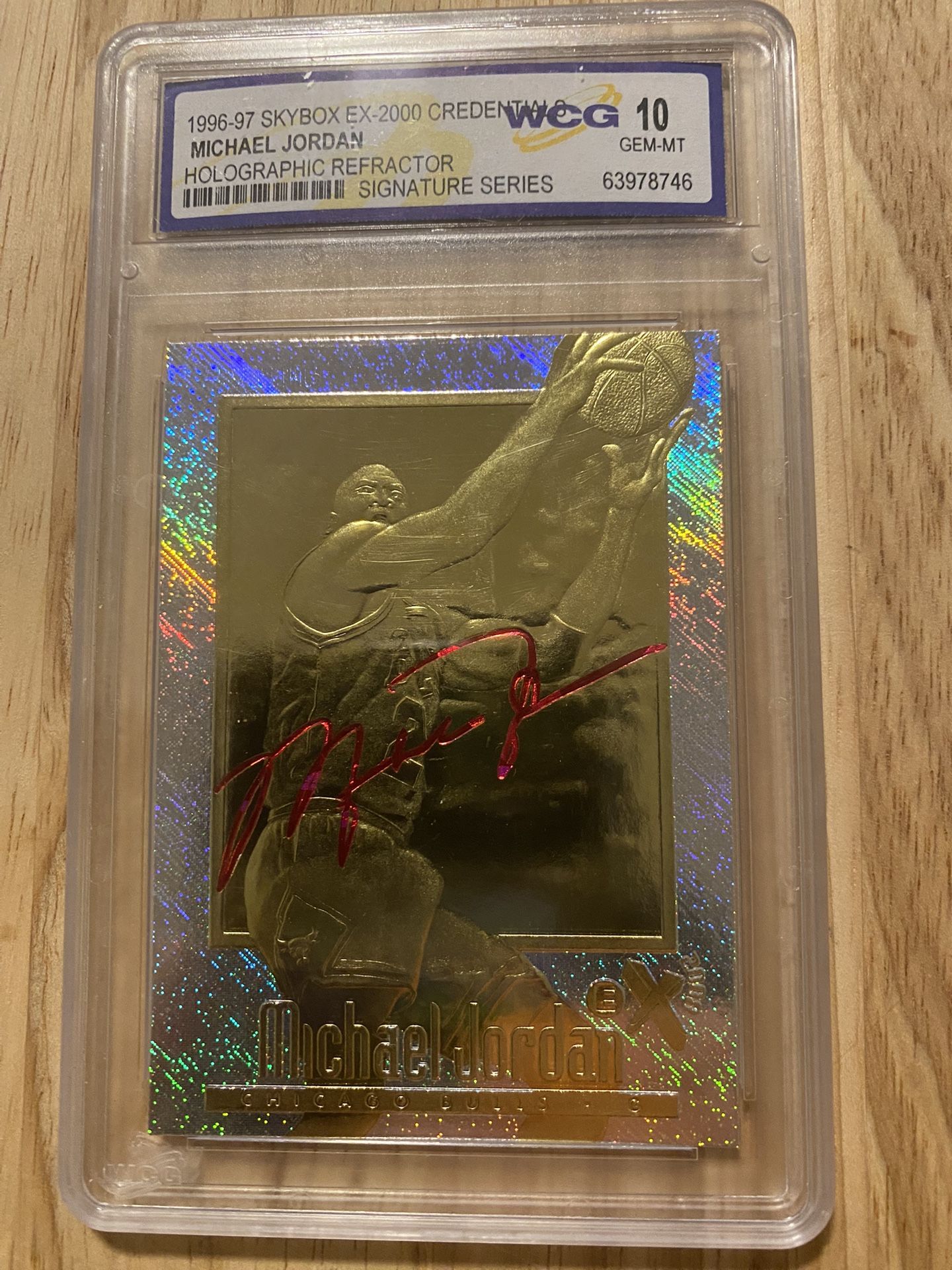 NO 13138 WCG gem-mt Michael Jordan Holographic refractor. Never been exposed to heat nor sunlight. Collector approved this one is rare due to a lot of these don’t have Michael’s left elbow brace when issued but this one does.
