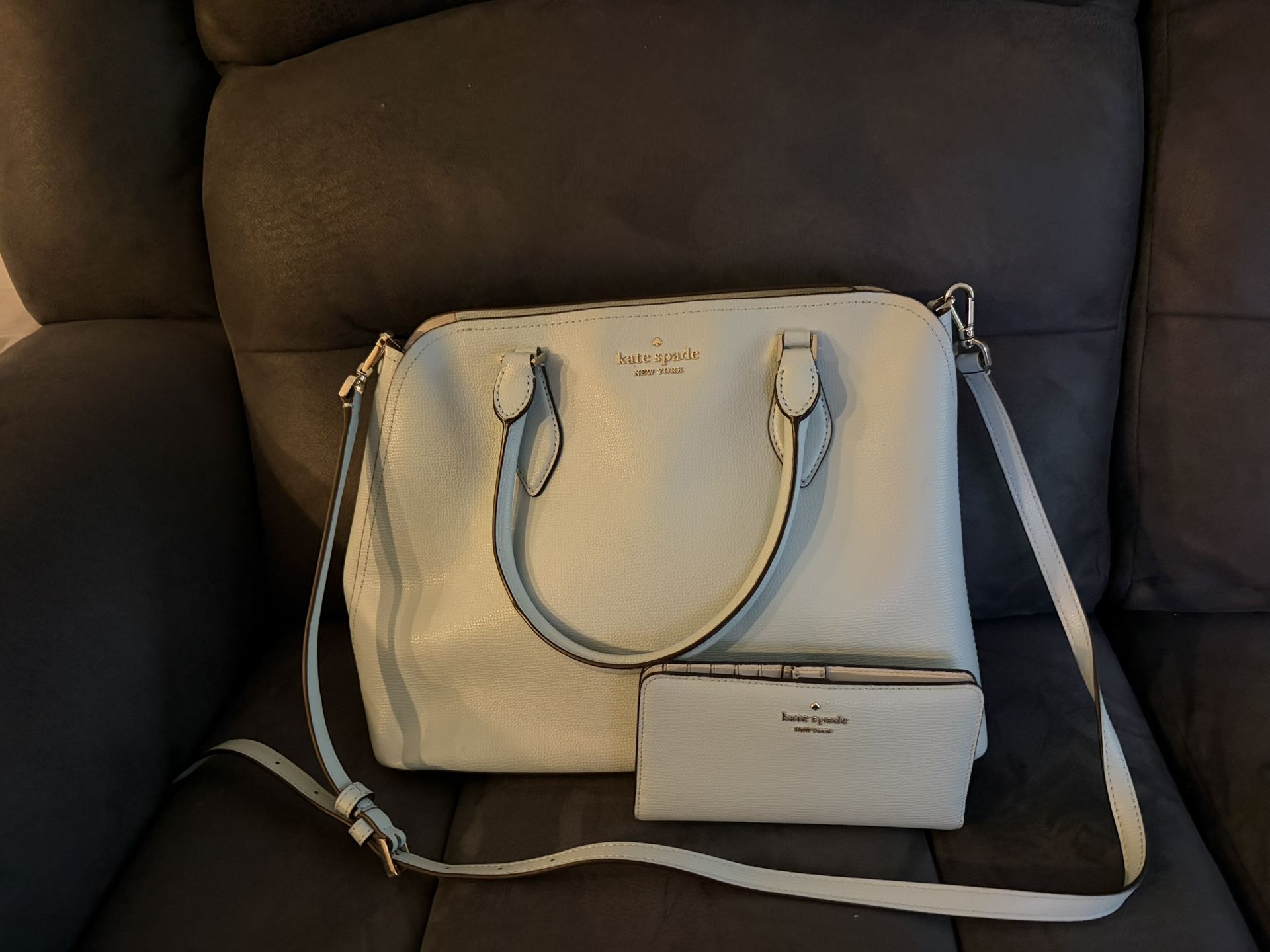 Kate Spade purse with matching wallet. The color is light blue.