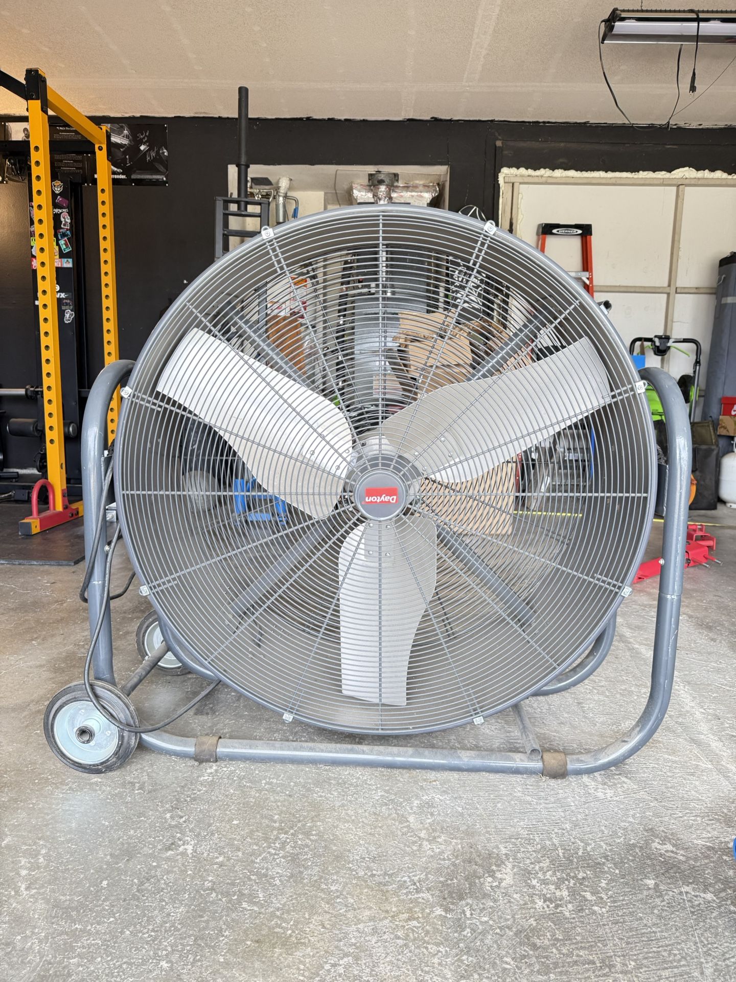 Used $300 obo Standard-duty industrial mobile and stationary floor fans cool heavy manufacturing areas and other dusty or dirty environments. Compared to light-duty industrial fans, these standard-duty fans are made of heavier-gauge materials, have a higher-horsepower motor, and feature more-robust motor bearings for a longer life BrandDAYTONBlade Diameter36 inWheeled BaseMobileOscillationNon-OscillatingWatts615/500Number of Speeds2Voltage120V ACPhase1Air Flow8,350/12,250 cfmMotor HP1/2 hpRPM850/750Amps5.3/4.7Fan Mounting LocationFloorAir Velocity @ 20 Ft.390/340 fpmAir Velocity @ 40 Ft.250/190 fpmAir Velocity @ 60 Ft.150/75 fpmAssembly RequiredYesSound Level73 dBAMax. Ambient Temp.104 °FHz60 HzMotor EnclosureTotally Enclosed Air OverMotor InsulationClass BMotor TypePermanent Split CapacitorThermal ProtectionAutomatic ResetBearing TypeBallFan Cord Length9 ftNEMA Plug Configuration5-15PHeight40-5/16 inWidth46 inDepth20-1/4 inNumber of Blades3Blade MaterialAluminumShaft Dia.5/8 inFan Housing MaterialSteelColorDark GrayGuard MaterialSteelWire Guard FinishPolyester Powder Coated Dark GrayWheel Dia.7 inWheel MaterialSteel/RubberNumber of Conductors3Height AdjustmentFixed HeightDrive TypeDirect DriveStandardscULus ListedIncludes7 in Steel and Rubber Wheels; Cord Wrap; Tilt Fan HousingEnvironmental ApplicationsIndustrialProduct TypeStandard-Duty Industrial FanUNSPSC(contact info removed)2