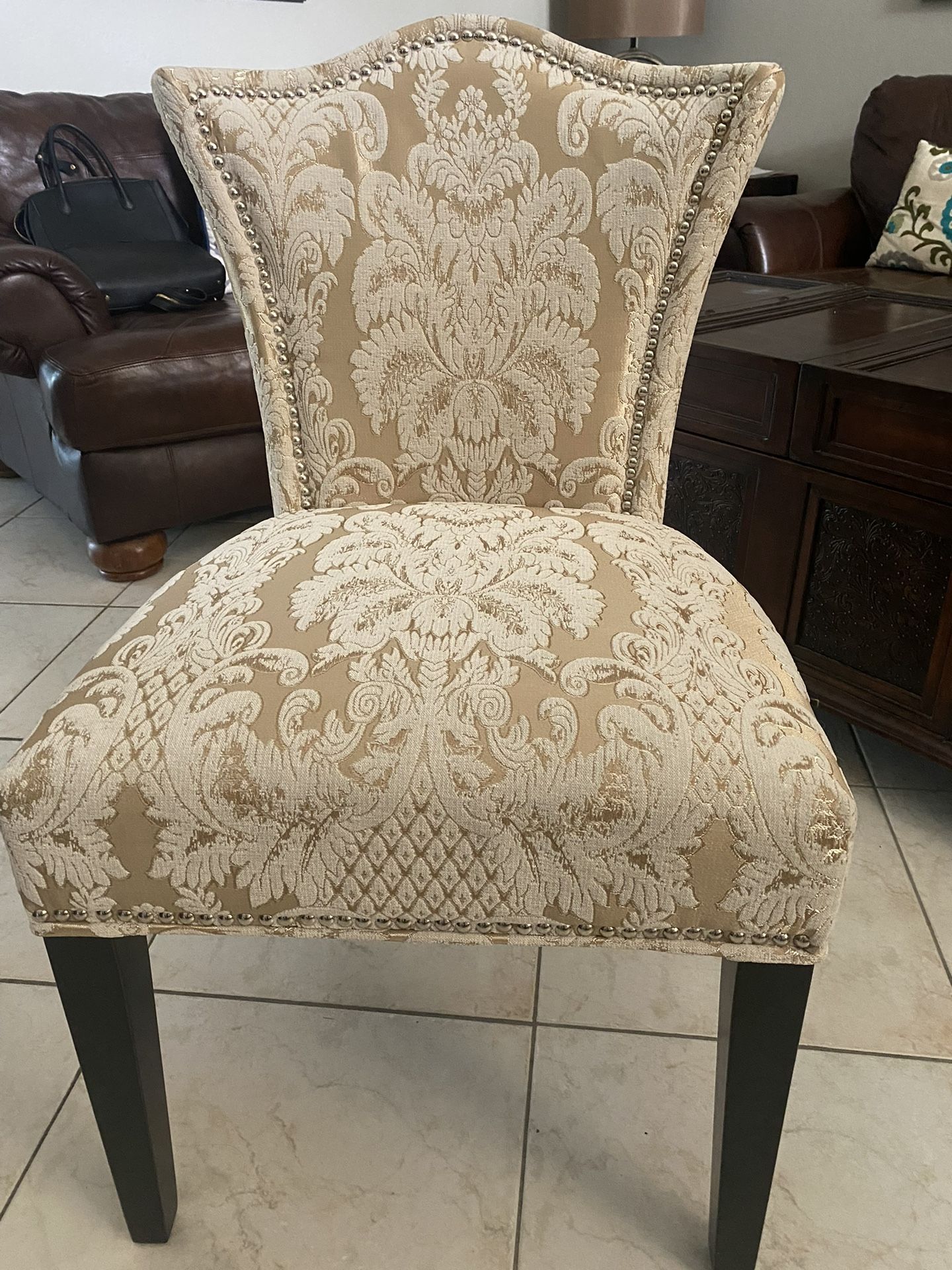 Creme and gold barely used accent chair. Very beautiful and comfortable. Contemporary and classic style influences coming together in a beautiful way. Make me an offer! Features: Upholstered, Stud Detail and Trim.