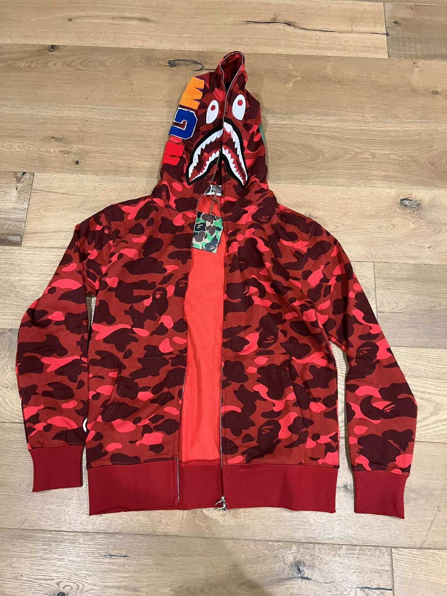 Red Camo Bathing Ape Shark zip-up hoodie brand new in bag! MEDIUM & LARGE available. Message me with any questions or if you’d like more pictures!