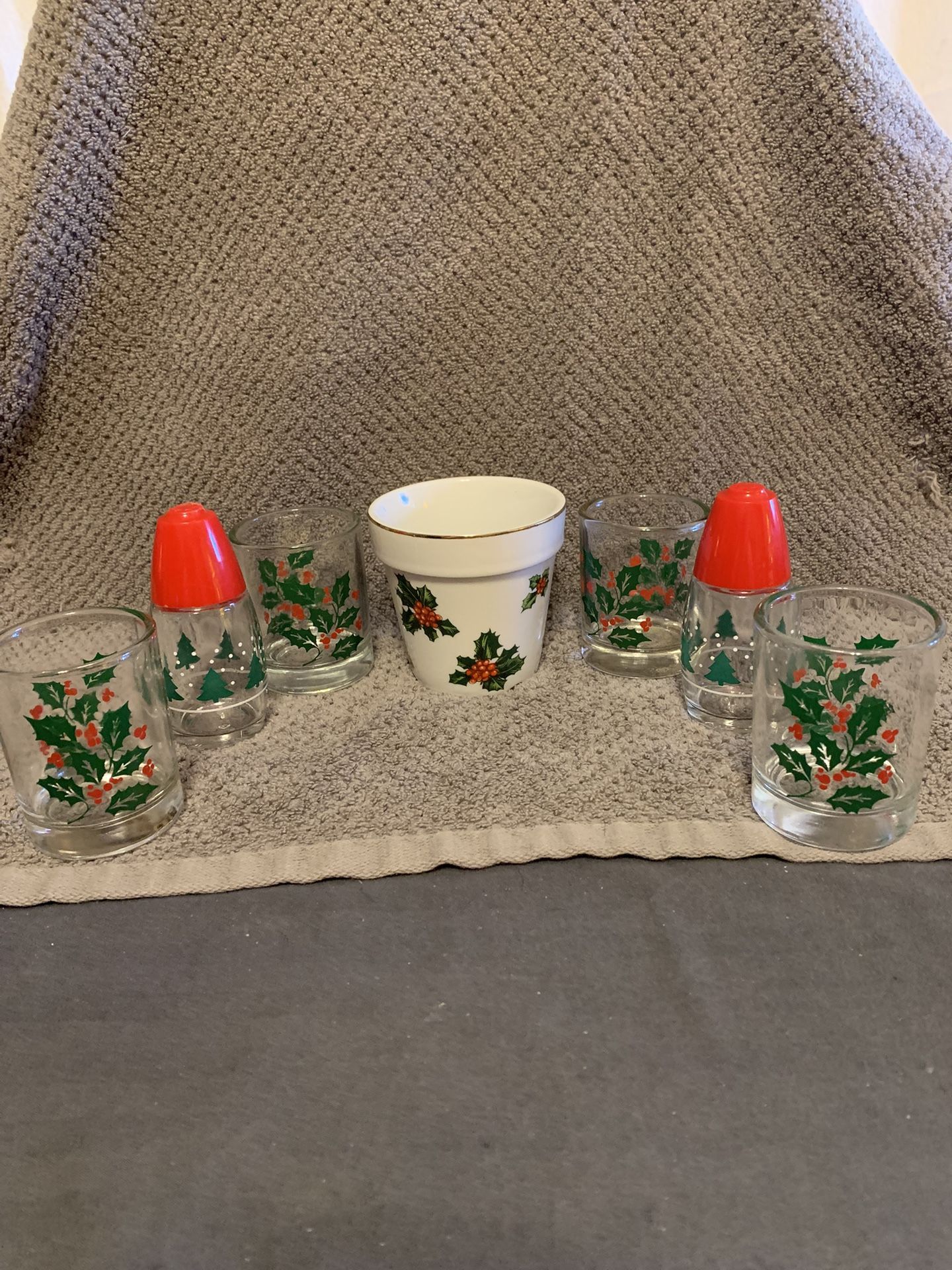 There are 4 small votive candleholders /shot glasses. I have a salt & pepper shaker with the Holly pattern on them and red lids. Plus one small plant holder with Holly on it also.