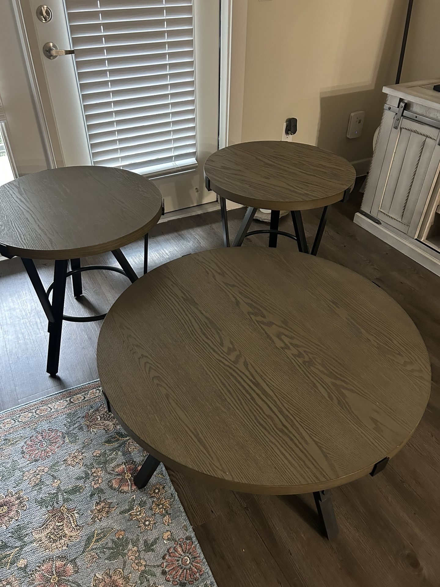 A 3-piece wooden round table set with metal legs. Made in Vietnam, sold at Ashley Furniture. The large table is 36 inches wide and 18 inches tall. The two side round end tables are 24 inches wide / each and 24 inches tall / each.