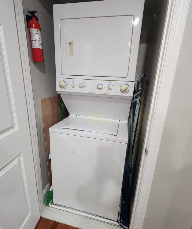 27" tall x 24" wide x 26" deep. Fits perfectly in laundry closet space! Top load washer. Front load drier.
