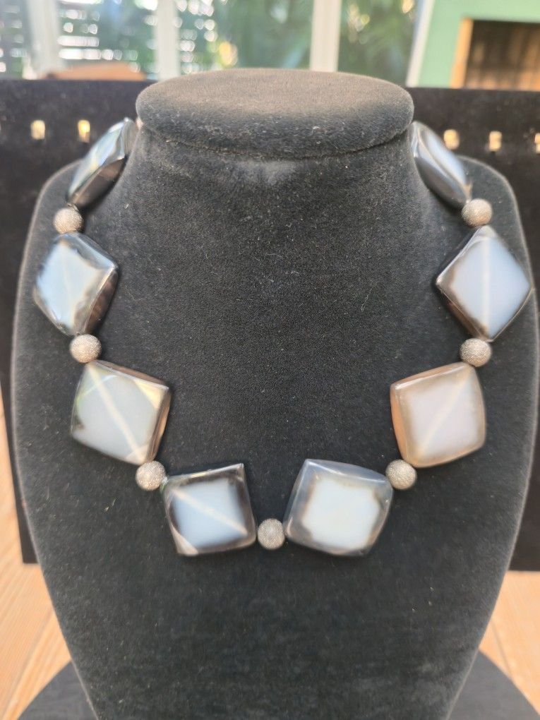 Artisan Crafted grey Agate choker , with sterling silver Grey glitter beads in-between Agate squares, measures-16in. With round M.O.P clasp.