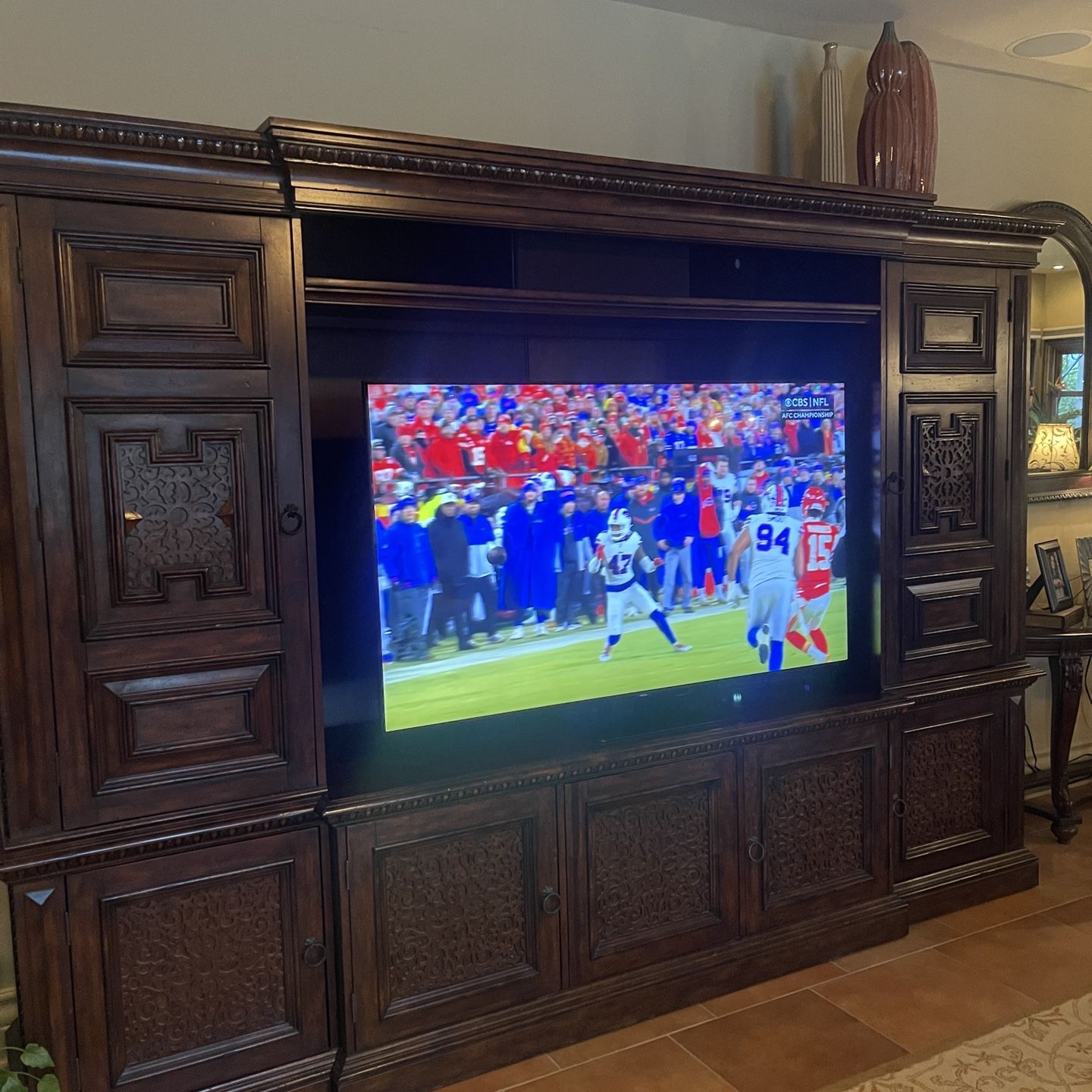 Dark wood entertainment center. Shelf over TV is adjustable & has a light that has 3 settings. It is controlled by tapping the upper side of the entertainment center. Side cabinets have 2 adjustable shelves. 5 cabinets across bottom also have 2 adjustable shelves each. Lots of storage! Beautiful engraving along top of & below TV area. Decorative engraved panels on center of the 2 side doors & all along bottom doors. Very heavy & sturdy. Beautiful piece that will match many decorating styles. (Paid $7,500 for it from Janeen’s Furniture) 9’10”-W 2’-D 6’11”-H TV Area 5.5’ W (top shelves is adjustable)