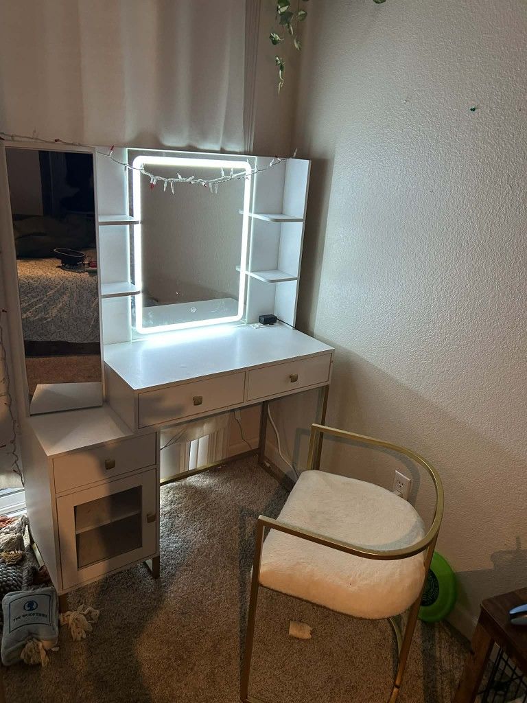 A white Vanity with 2 outlets, and with 3 differet light modes. Comes with the chair. 4 feet 7 inches tall 3 feet 5 inches length 1 feet 4 inches wide The left leg broke off but once you put it where you want it. You can put it right back on for stable balance.