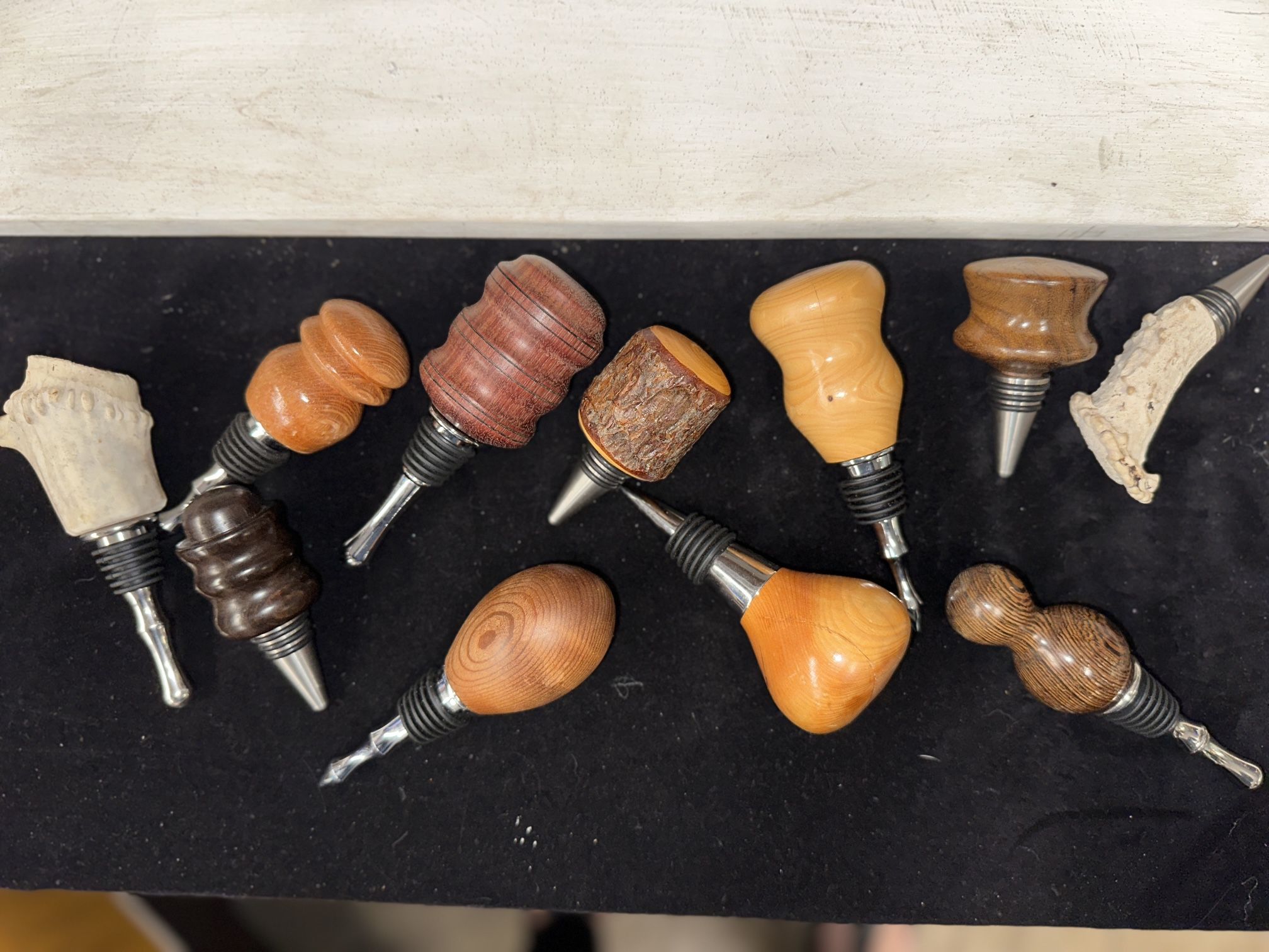 Handmade bottle toppers carved from wood. I can’t tell you what kind of wood my uncle made them and he has since passed. You can buy them five dollars each or if you want them all make me an offer