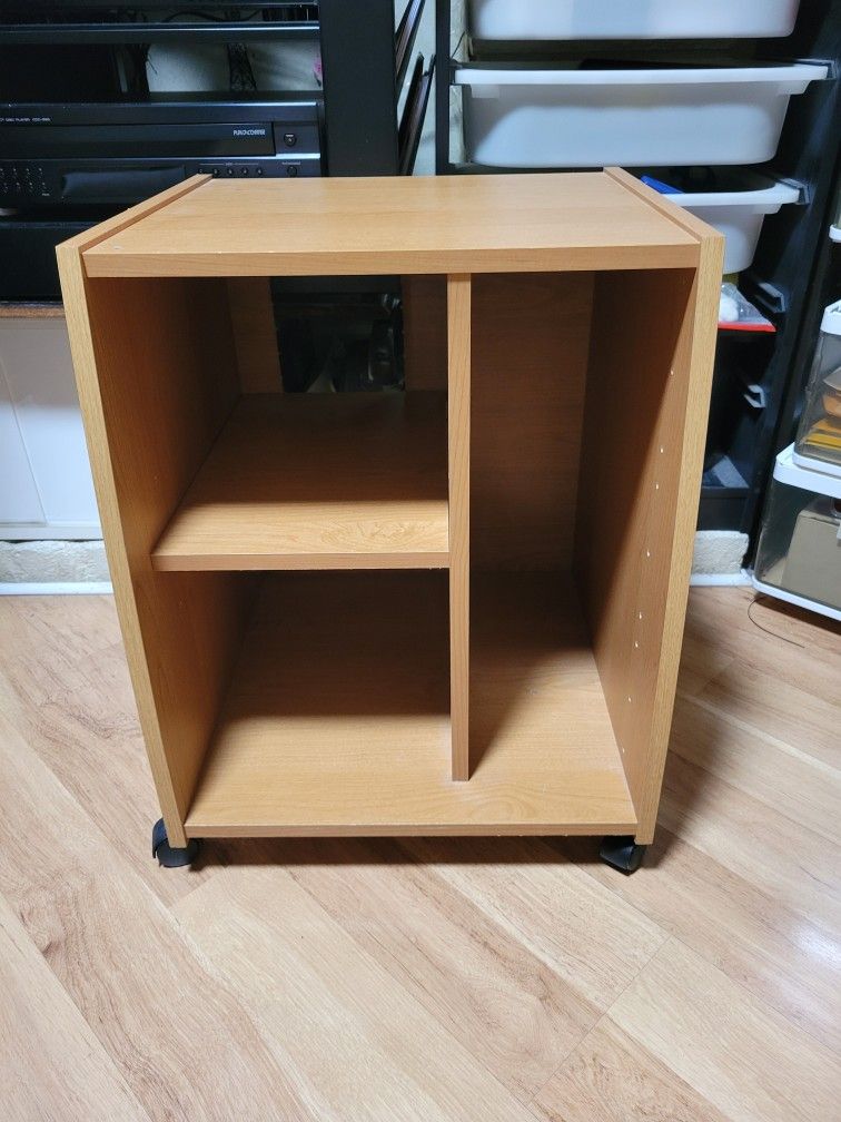 Used , Design: It typically features a vertical compartment on one side and a partitioned section with a shelf on the other, providing flexible storage for various items. Mobility: It is equipped with four rubberized casters, allowing for easy movement throughout a room. Kitchen/Office: Storing a mini-refrigerator, microwave, printer, or TV stand . other compact appliances. General Storage: Serving as a plant stand, nightstand, or a mobile unit for AV equipment. H 22 5/8 W 17 3/4 D 17 5/8 On top had a little water spot as shown in pictures.