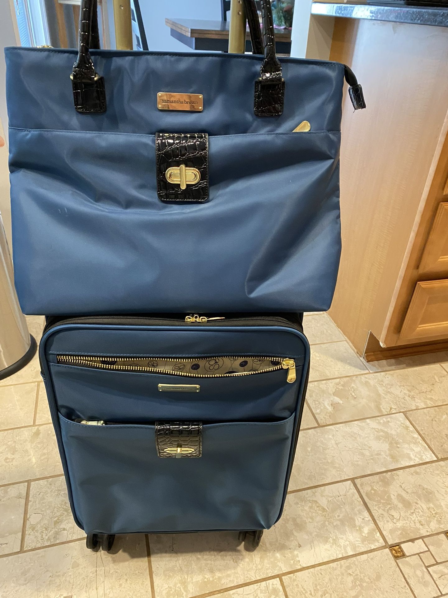 Samantha Brown - 25” expandable carry on luggage with Tote. Hardware is Gold Tone, Telescopic Handle and inline skate wheels. Carry on luggage used once. Never used/ Tote has RFID protected Pocket.