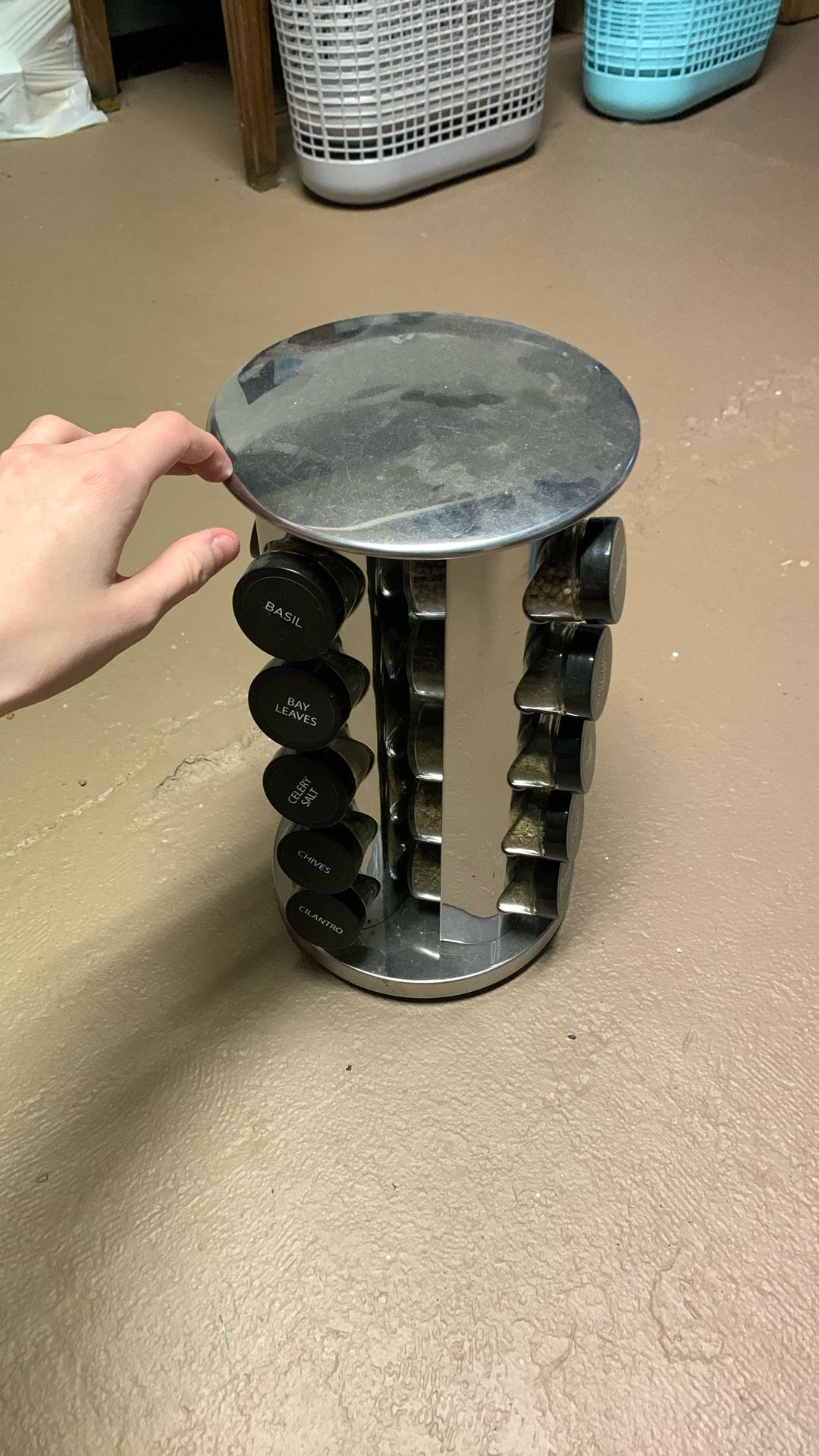 Bought and never used. Working spinning spice rack; a little dusty but no dings or dents; spins perfectly no hesitation or noise; wouldn’t quite trust the spices that are currently inside but they are included.