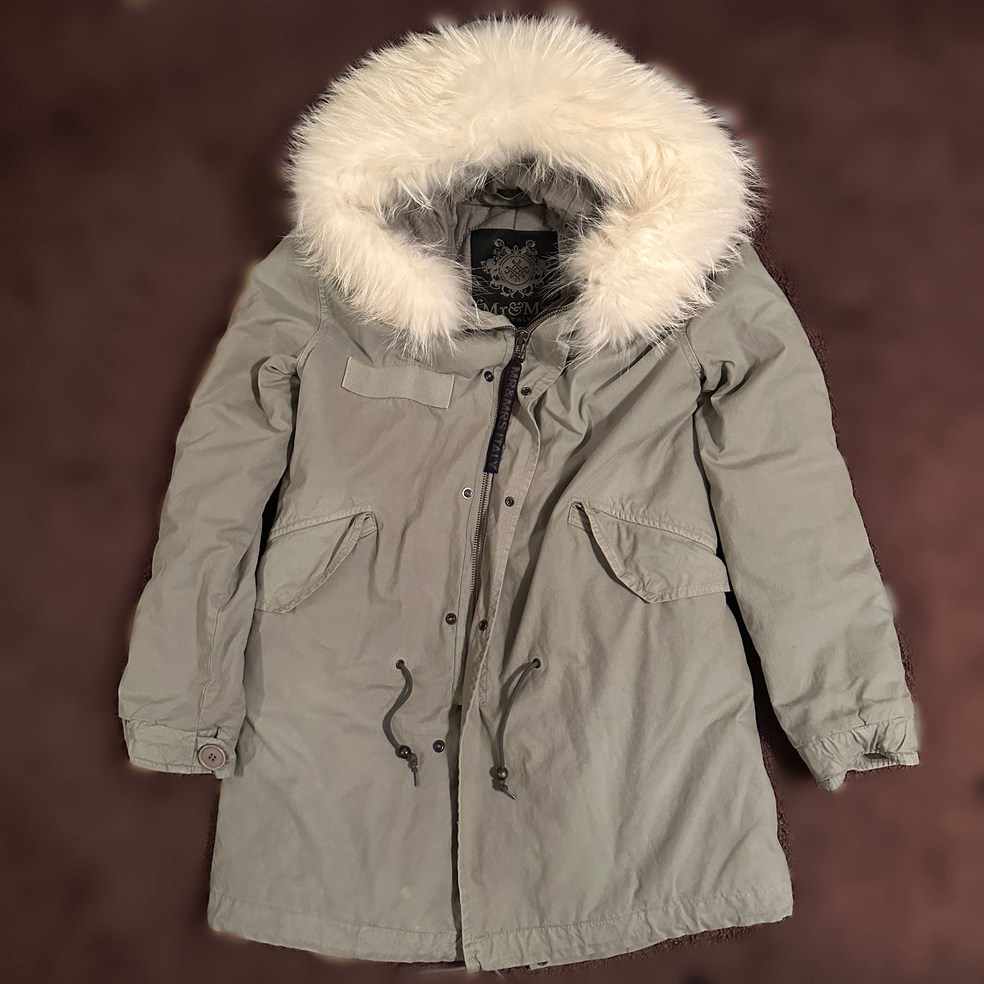 Elevate your winter wardrobe with this iconic Mr & Mrs Italy Parka. Known for blending military-inspired utility with Italian luxury, this piece features a stunning, voluminous fur trim in crisp white against a sleek light gray cotton canvas shell.