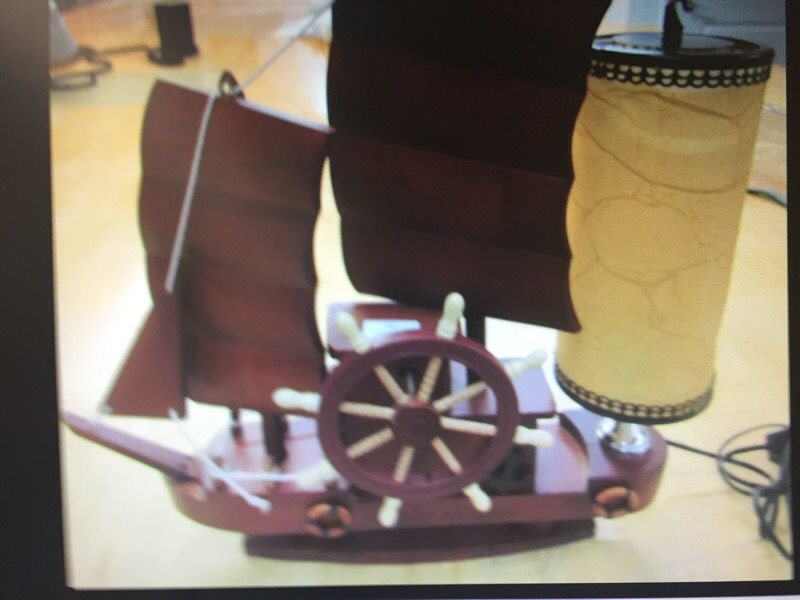 This is a very unique model ship that is also a lamp. It has a shade that covers the light bulb in the back end of the ship. The wheel also turns and activates a music box which sings "It's a small world." LWH 18x6x19