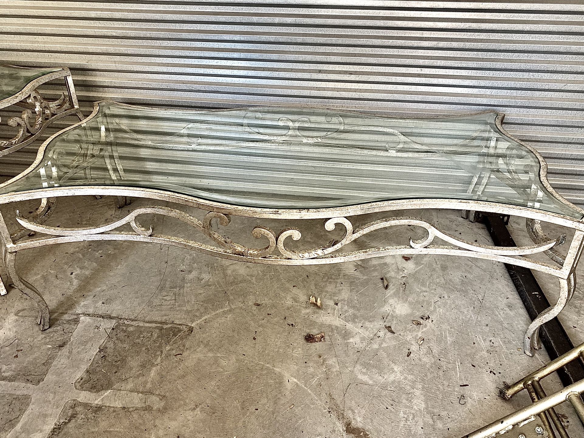 Custom silver leaf antiqued iron coffee table and side table. Thick glass beveled tops. Custom made in San Diego for an interior designer. Cocktail Table: 30” wide x 60” long x 18” high. Side table: 28” x 28” x 22” high Must be picked up by October 1st