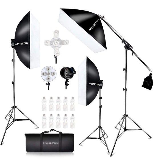 Bought it 2 years ago and barely ever used. Everything is in working ored and good condition. Bulbs are included. The entire kit is folded and stored in 2 bags. Includes: 2 X Umbrella lighting kit 4 X Clips 6 X Clamps 3 X Soft box lighting kit Boom Arm 3 X Backdrops( Black, White, Green) 1 X 8.5*10 ft backdrop stand Bulbs