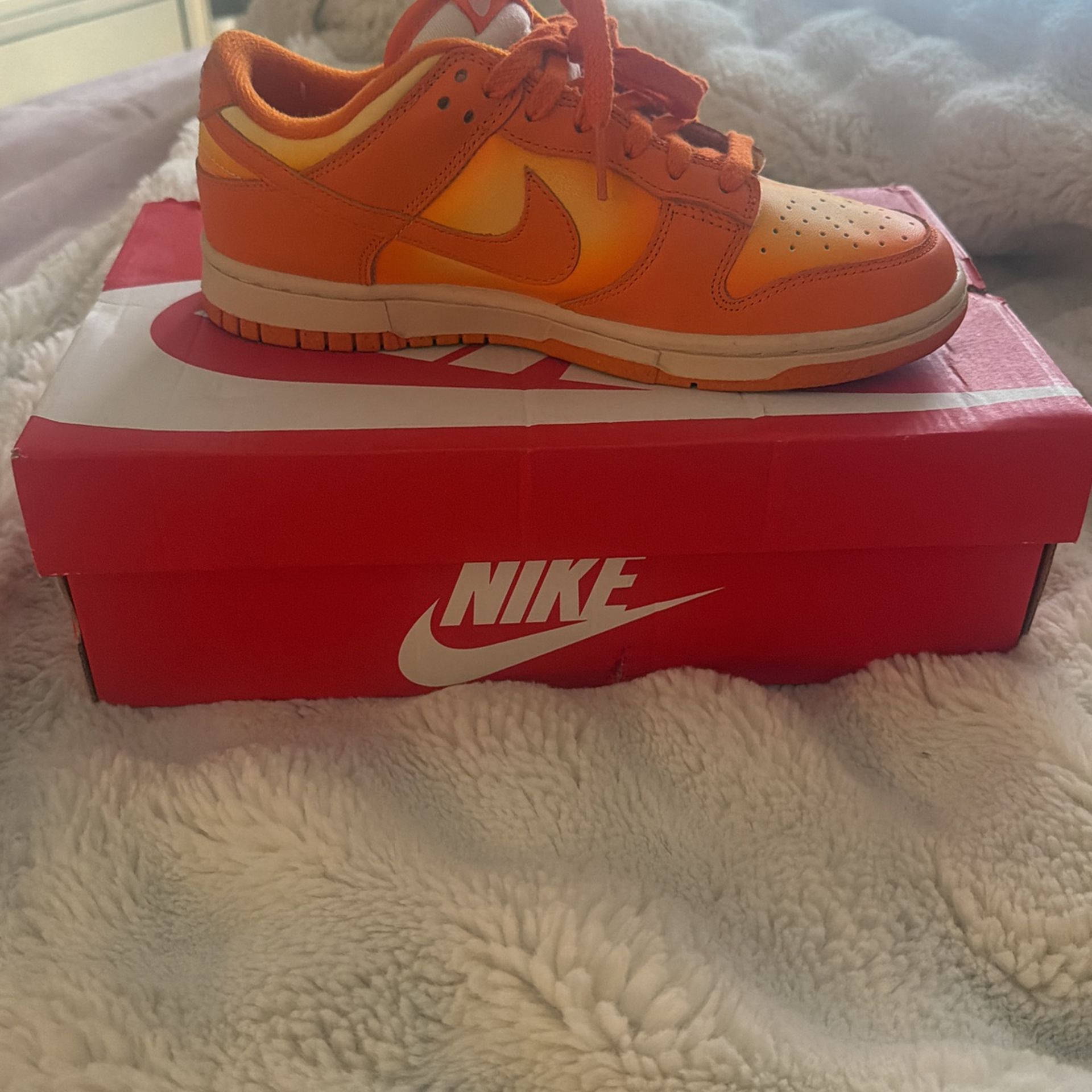 Lightly worn Orange NIKE DUNK LOW in original box size 8.5. 1/2 off Original price.