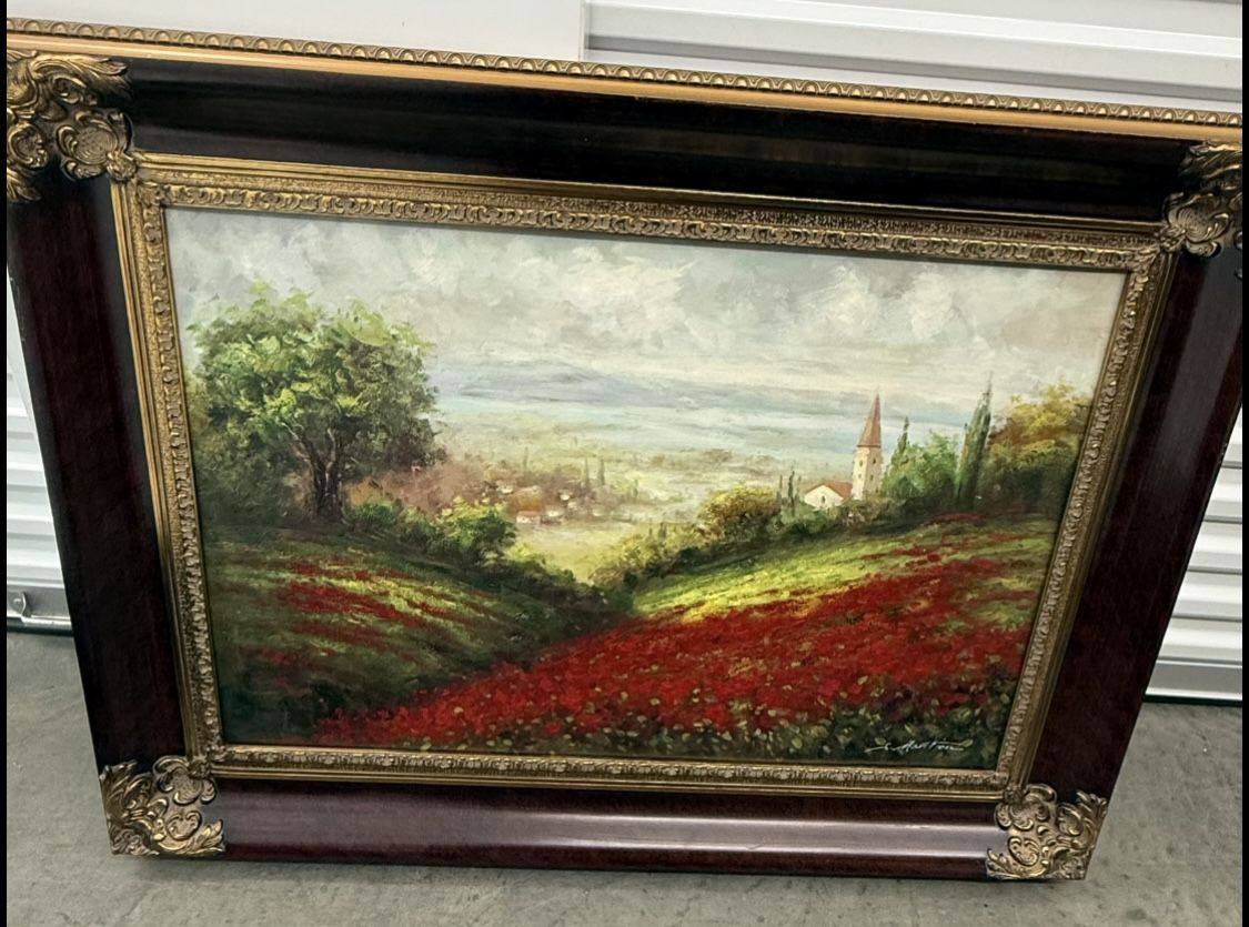 The painting depicts a bright landscape with a large field of red poppies in the foreground and a small village with a church steeple in the distance, It is housed in an ornate, dark wood frame with gold-toned corner accents. Came from Smoke and pet free house. Please check the rest of my listings, thanks!