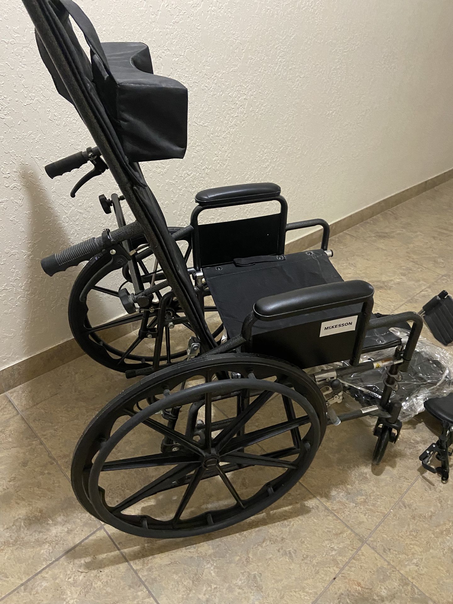 McKesson reclining foldable wheelchair 300lb capacity. Like new . Purchased for $370 and it never was used except couple of times. Collecting dust so time to let it go.