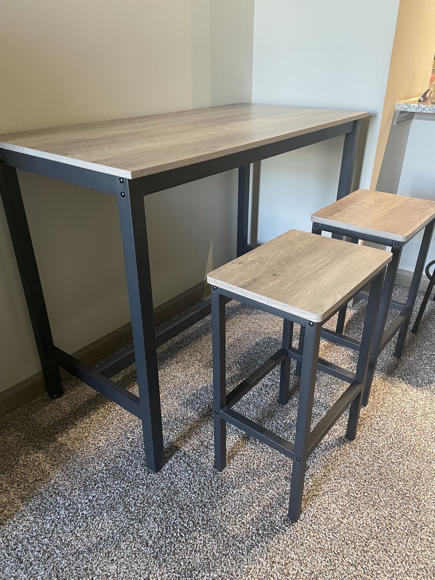 Bar table with 2 matching stools in great condition. Compact and perfect for apartments or small dining areas. Table is bar height (approx. 40 inches tall) with a slim design, and stools fit neatly underneath when not in use. Clean, sturdy, and ready for pickup!