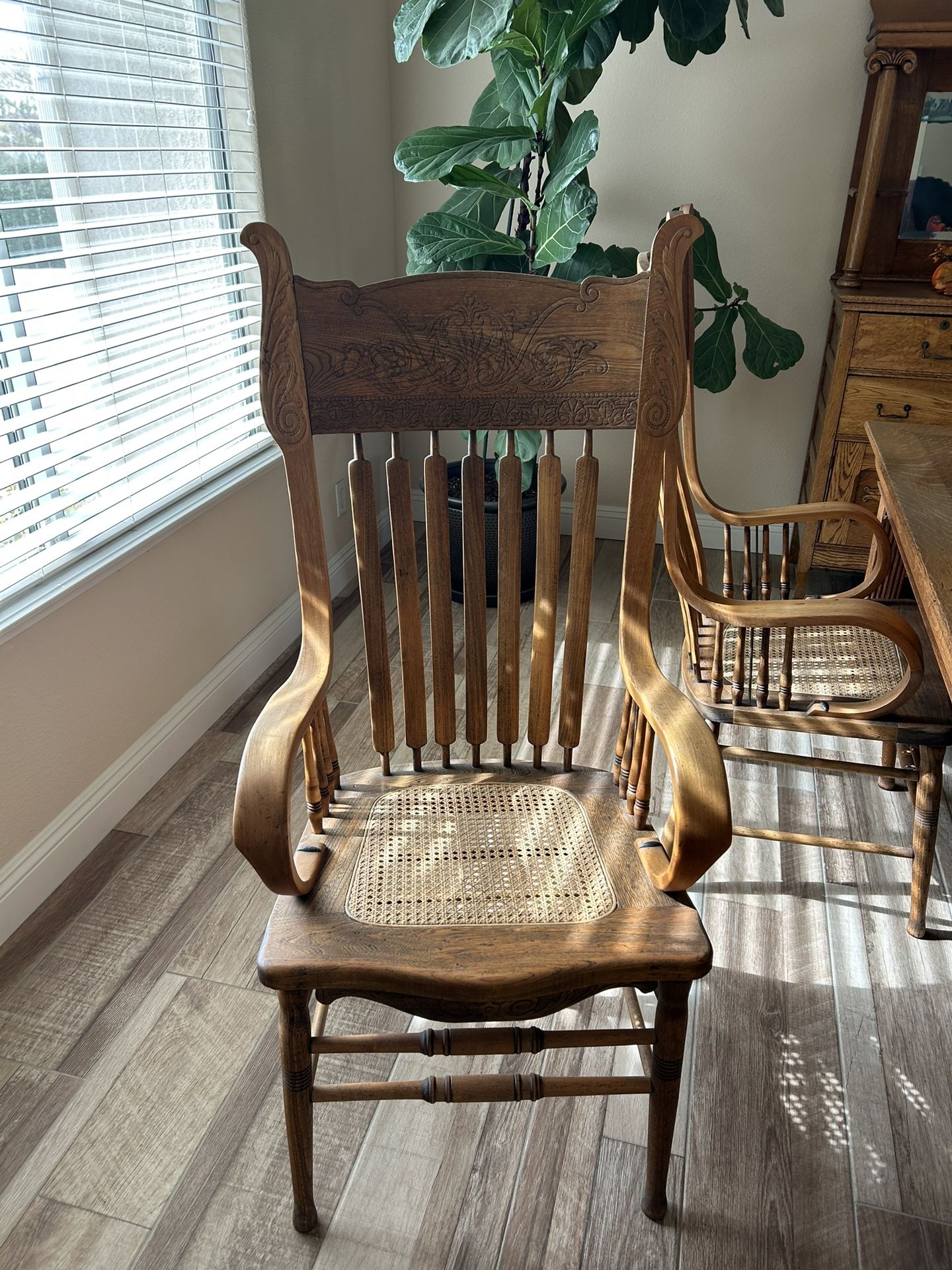 Just in time for Christmas, 4 large press back chairs with cane bottom inserts, very OLD and very comfortable in great condition. Originally from a grange in Indiana.