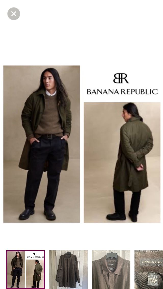 Brand: Banana Republic Item: Mac coat (long jacket) Gender/Size: Mens Large (L) Color: Dark olive green Shell/Lining: 100% polyester Closure: Hidden full-length zipper with snap-front storm placket Chest measures 25” pit to pit with a 35” length from shoulder to hem. Preworn, in great condition without flaws to note.
